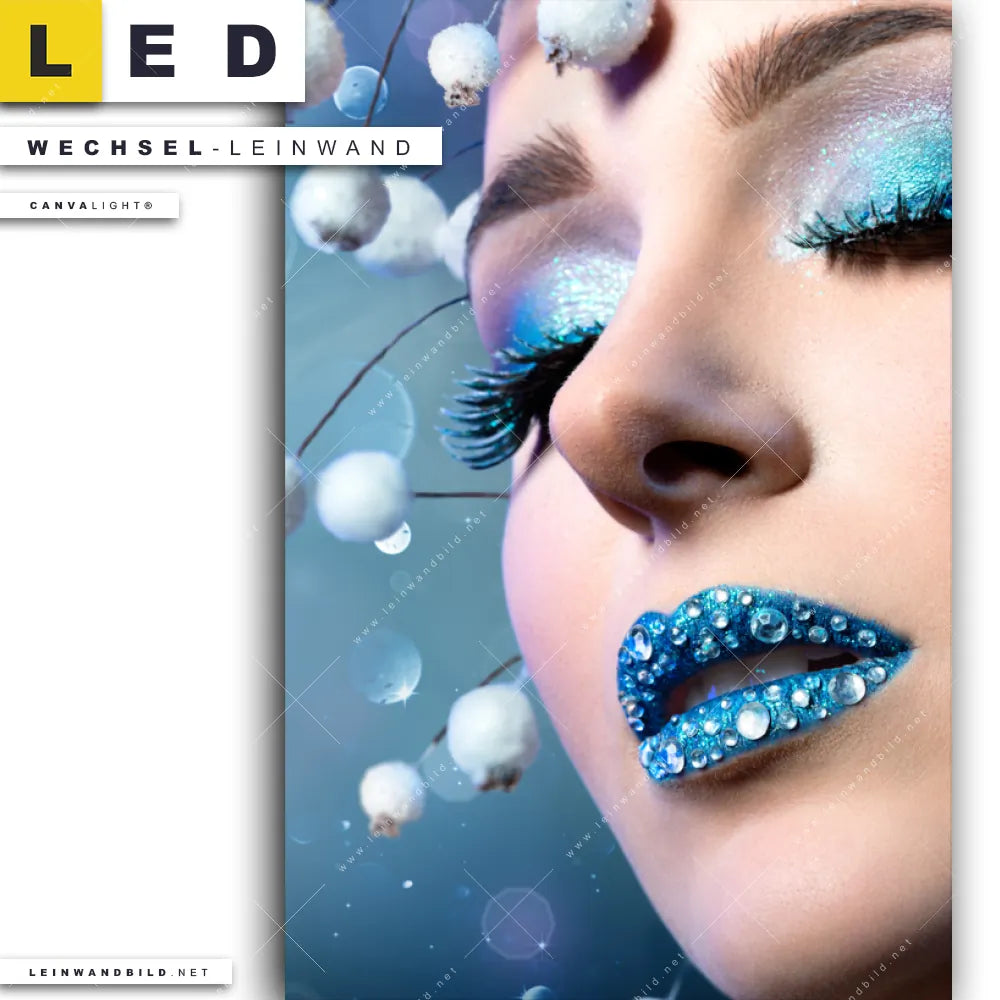 Dann sollte die Wechsel-Leinwand Canvalight® TEX | Schönheit in Blau & Weiss | Hochformat den Weg zu Dir finden. Die Austausch-Leinwand anmutige, kühle Frau - passend für unsere stufenlos dimmbaren, steckerfertigen Leinwandbilder im Leuchtrahmen mit Fernbedienung und optionaler Farbtemperatursteuerung - fügt sich als Eye-Catcher harmonisch in jedes Friseur - Beauty, Bar - Gastronomie, Flur - Eingangsbereich, Wohnzimmer - Schlafzimmer Raumkonzept ein.