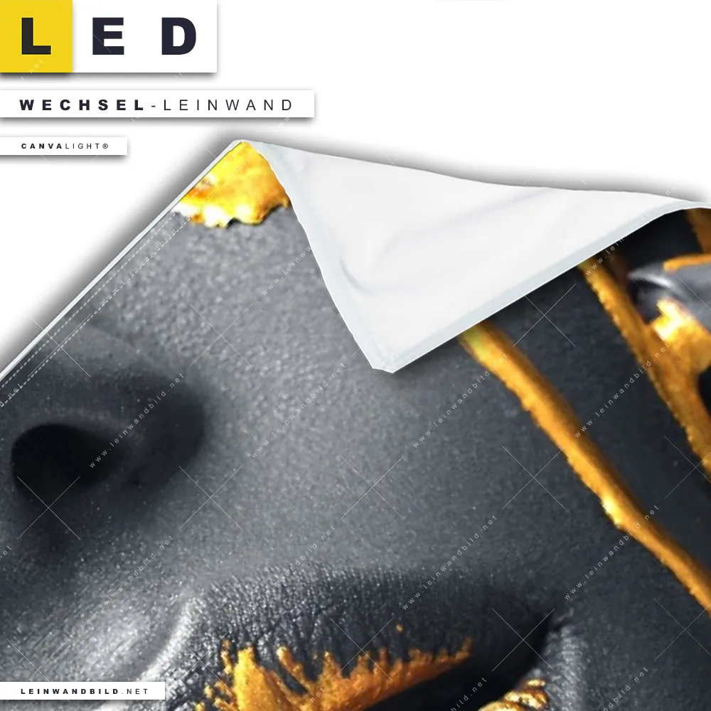 Dann sollte die Wechsel-Leinwand Canvalight® TEX | Schönheit in Silber & Gold | Hochformat den Weg zu Dir finden. Die Austausch-Leinwand Attraktivität in metallischen Farben - passend für unsere stufenlos dimmbaren, steckerfertigen Leinwandbilder im Leuchtrahmen mit Fernbedienung und optionaler Farbtemperatursteuerung - fügt sich als Eye-Catcher harmonisch in jedes Friseur - Beauty, Wohnzimmer - Schlafzimmer, Flur - Eingangsbereich, Büro - Kanzlei, Bar - Gastronomie Raumkonzept ein.