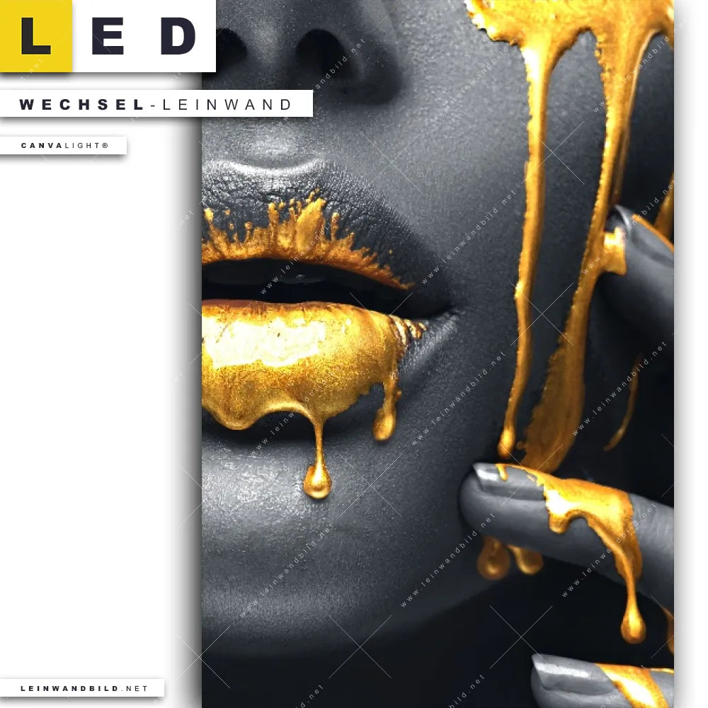 Du bist auf der Suche nach einer Porträts - Menschen Wechsel-Leinwand für Dein LED-Leinwandbild im Hochformat? Begriffe wie Frau, Lippen, Mund, Porträt, Erotik, modern, Gold, Silber, Farbe, Beauty haben Dich auf der Suche nach Deiner Ersatz-Leinwand für dein LED Wandbild mit wechselbarer Leinwand inspiriert? Farben wie Gold, Silber, Schwarz dürfen auf Deinem neuen Wechselmotiv für Dein XXL Leinwand-LED-Bild nicht fehlen und Leinwände im Modern Art Stil für Leuchtbilder passen perfekt zu Deinem Einrichtungsstil?