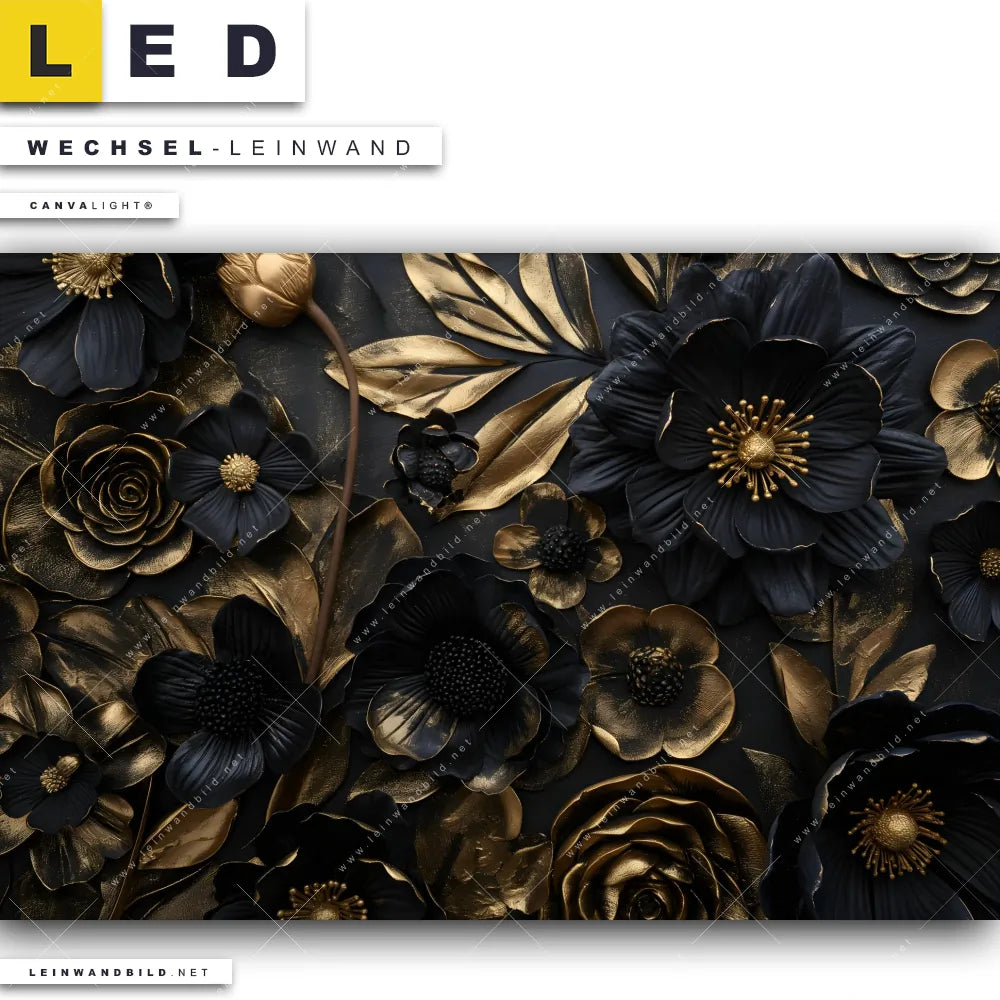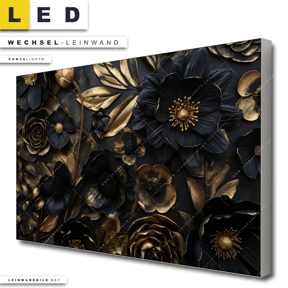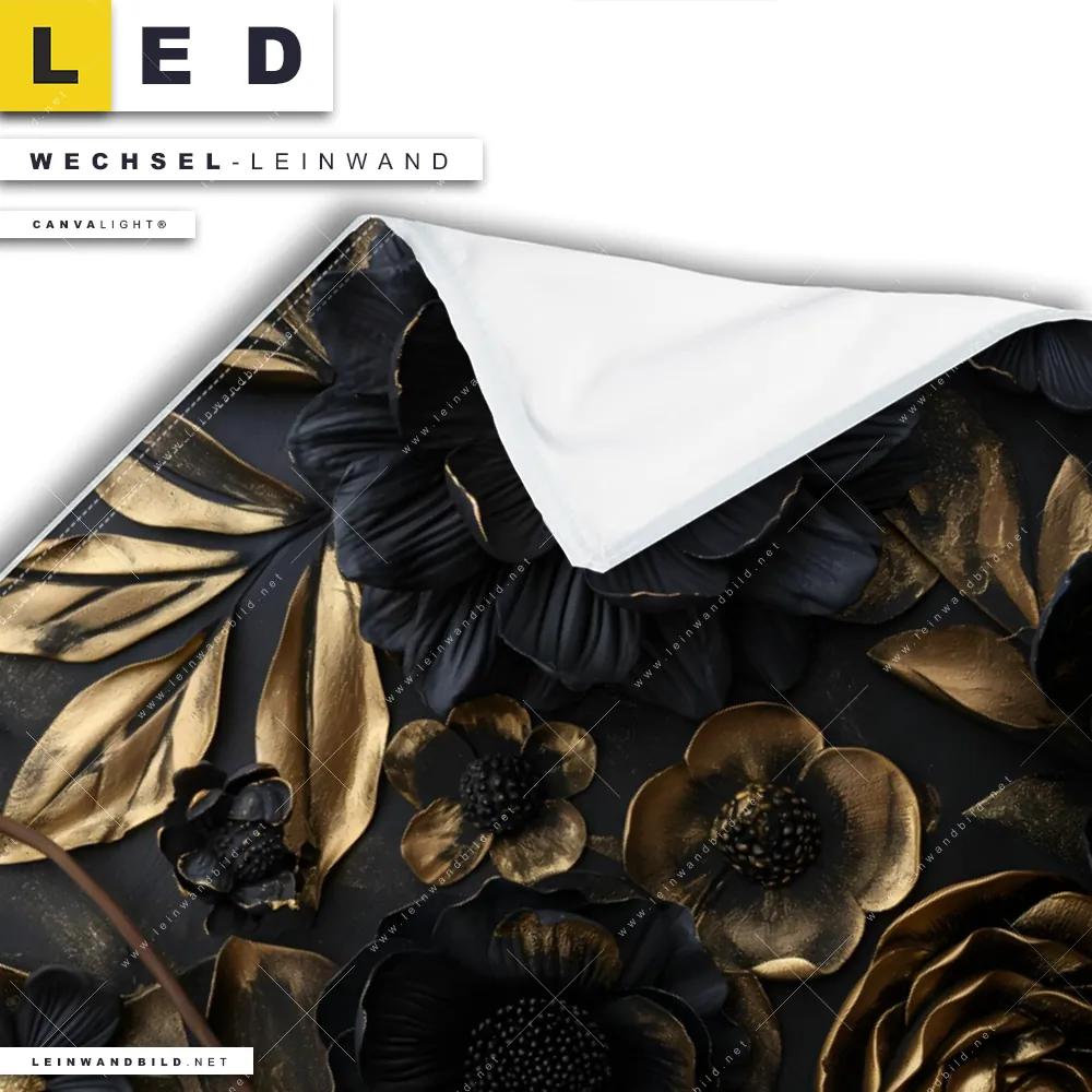 LED Wechsel-Leinwand Canvalight® TEX | Schwarze und goldene Blüten | Querformat