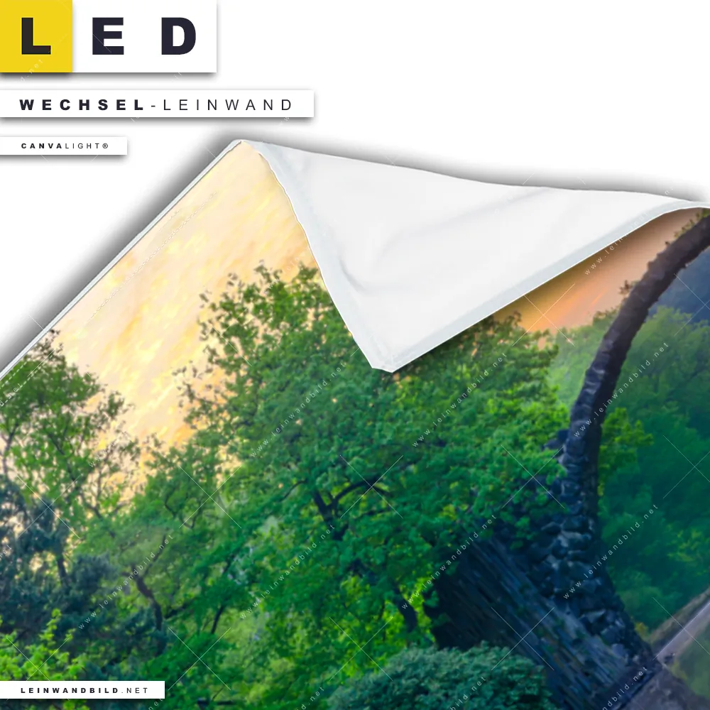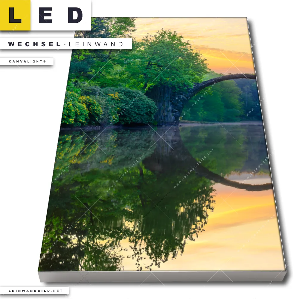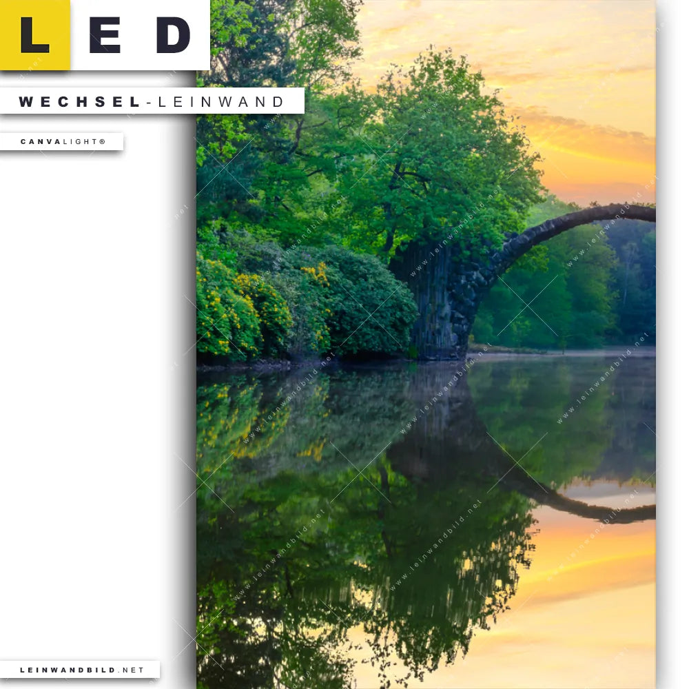 LED Wechsel-Leinwand Canvalight® TEX | See mit alter Brücke aus Stein | Hochformat