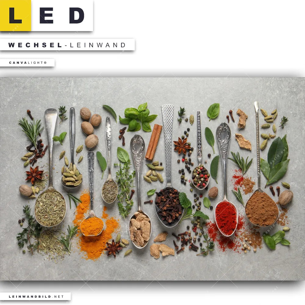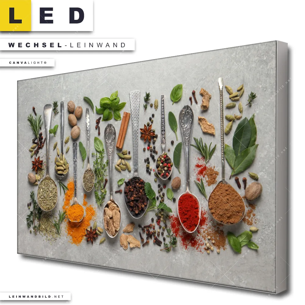 Du bist auf der Suche nach einer Essen - Trinken Wechsel-Leinwand für Dein LED-Leinwandbild im Querformat? Begriffe wie Gewürze, Kräuter, Löffel, kochen, Silberlöffel, Lebensmittel, frisch, lecker, gesund haben Dich auf der Suche nach Deiner Ersatz-Leinwand für dein breites LED Wandbild mit wechselbarer Leinwand inspiriert? Farben wie Bunt, Schwarz dürfen auf Deinem neuen Wechselmotiv für Dein XXL Leinwand-LED-Bild nicht fehlen und Leinwände im Modern Art, Natürlich - Realistisch Stil für Leuchtbilder passen perfekt zu Deinem Einrichtungsstil?