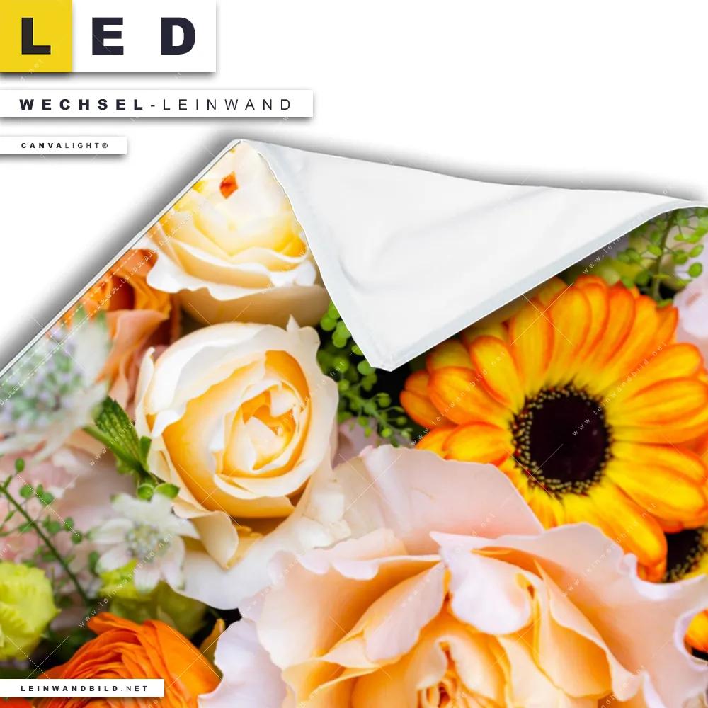 Du konfigurierst Deine individuelle LED Wechsel-Leinwand Canvalight® TEX | Sommerblumen | Querformat und wir produzieren sie NEU für Dich. Unsere Blumen - Botanik Austausch-Fotoleinwände für Canvalight® LED Bilder sind KEINE Lagerware. Du bist Dir unsicher, welches Motiv oder Format das richtige für dein individuelles LED Wechselmotiv auf Leinwand ist, dann helfen wir dir gerne weiter und beraten dich!