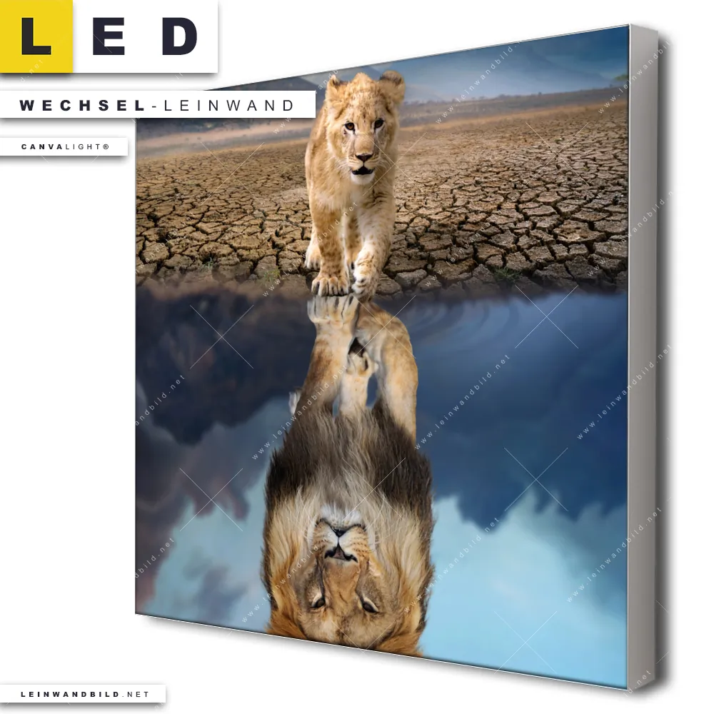 Du bist auf der Suche nach einer Tierwelt Wechsel-Leinwand für Dein LED-Leinwandbild im Quadratischen Format? Begriffe wie Raubkatze, Löwe, Afrika, wild, Safari, Lion, Löwenjunges, Spiegelbild, Wasserspiegelung, Spiegelung, Löwenbaby haben Dich auf der Suche nach Deiner Ersatz-Leinwand für dein LED Wandbild mit wechselbarer Leinwand inspiriert? Farben wie Braun, Beige, Hellblau, Blau dürfen auf Deinem neuen Wechselmotiv für Dein XXL Leinwand-LED-Bild nicht fehlen und Leinwände im Modern Art Stil für Leuchtbilder passen perfekt zu Deinem Einrichtungsstil?