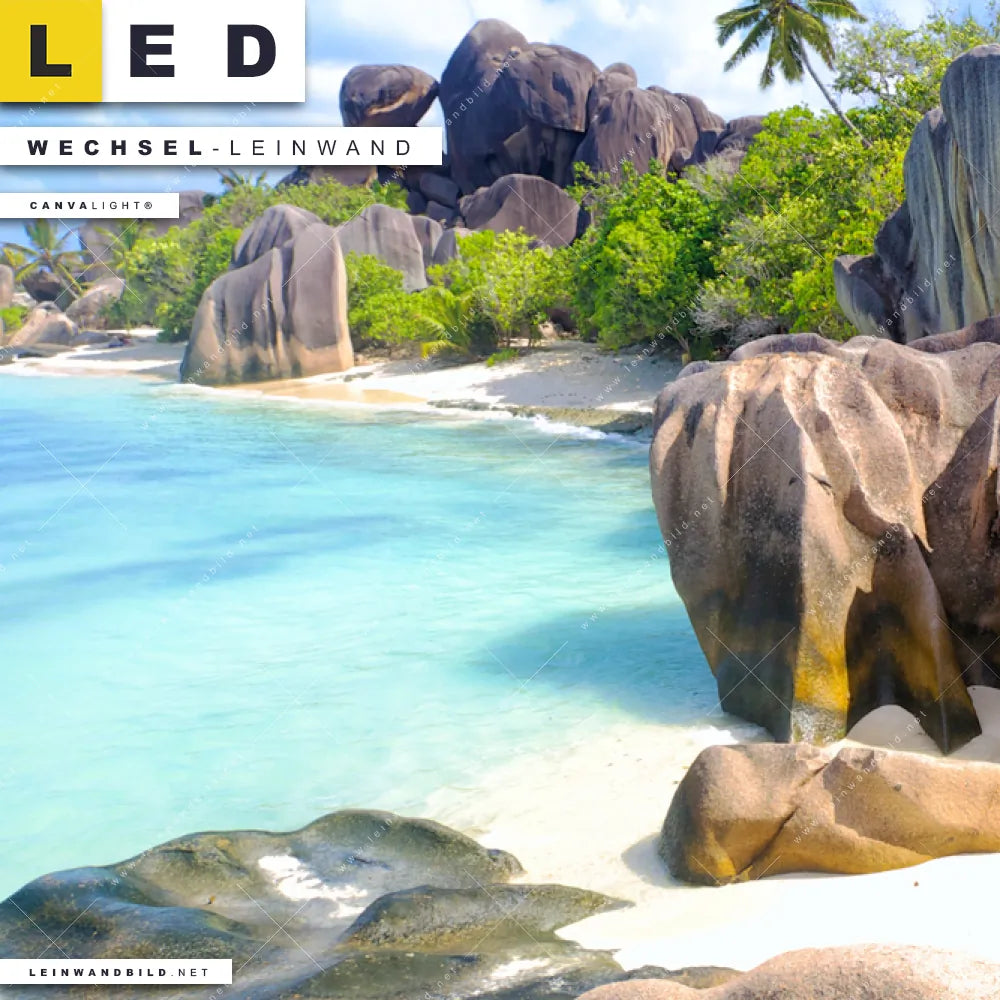 Dann sollte die Wechsel-Leinwand Canvalight® TEX | Südsee Paradies | Quadrat den Weg zu Dir finden. Die Austausch-Leinwand Weißer Strand mit Felsen und tropischen Pflanzen - passend für unsere stufenlos dimmbaren, steckerfertigen Leinwandbilder im Leuchtrahmen mit Fernbedienung und optionaler Farbtemperatursteuerung - fügt sich als Eye-Catcher harmonisch in jedes Arzt - Praxis, Bar - Gastronomie, Büro - Kanzlei, Wohnzimmer - Schlafzimmer Raumkonzept ein.