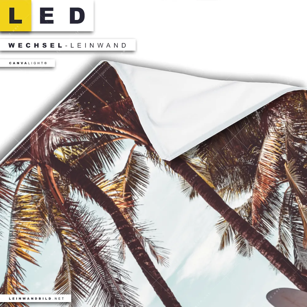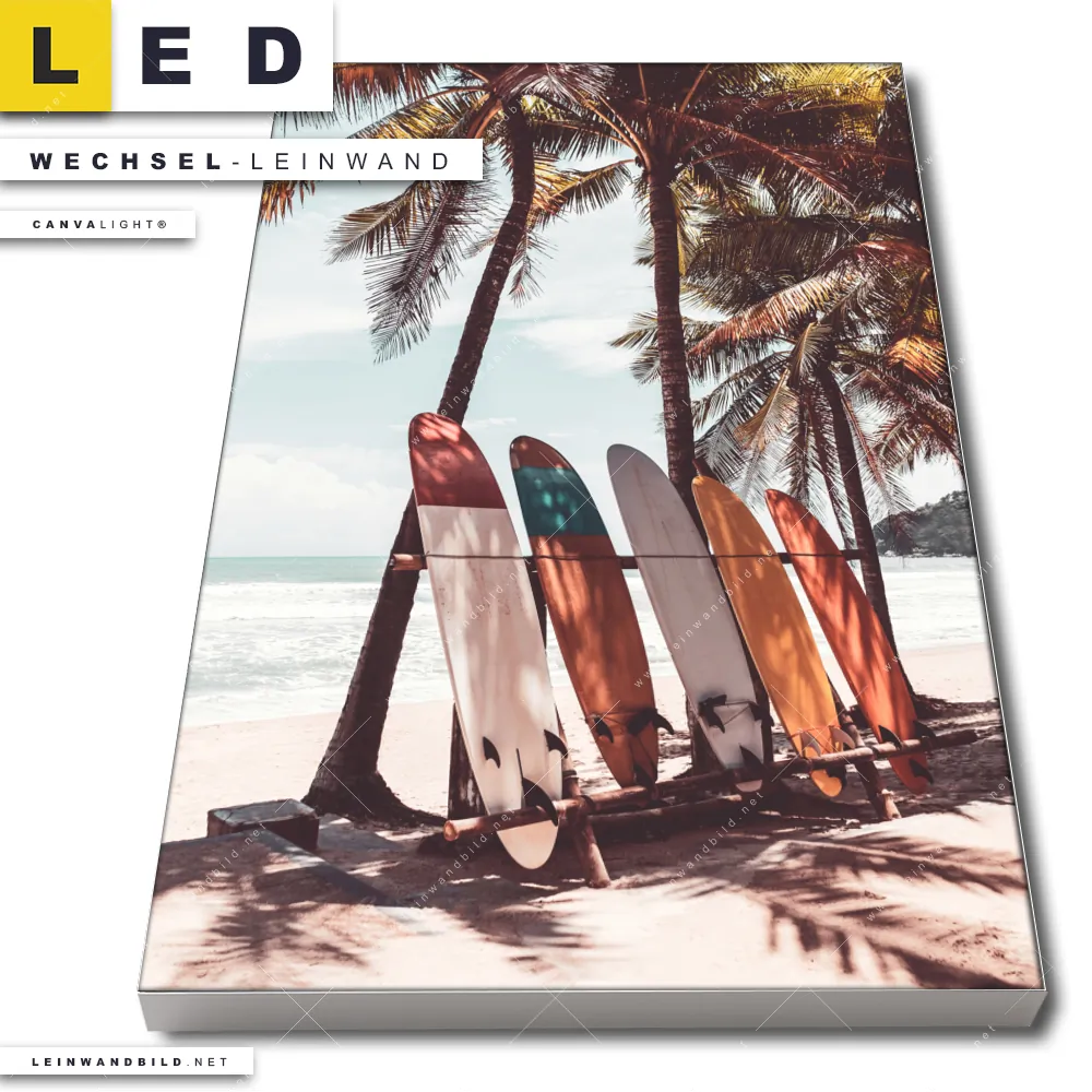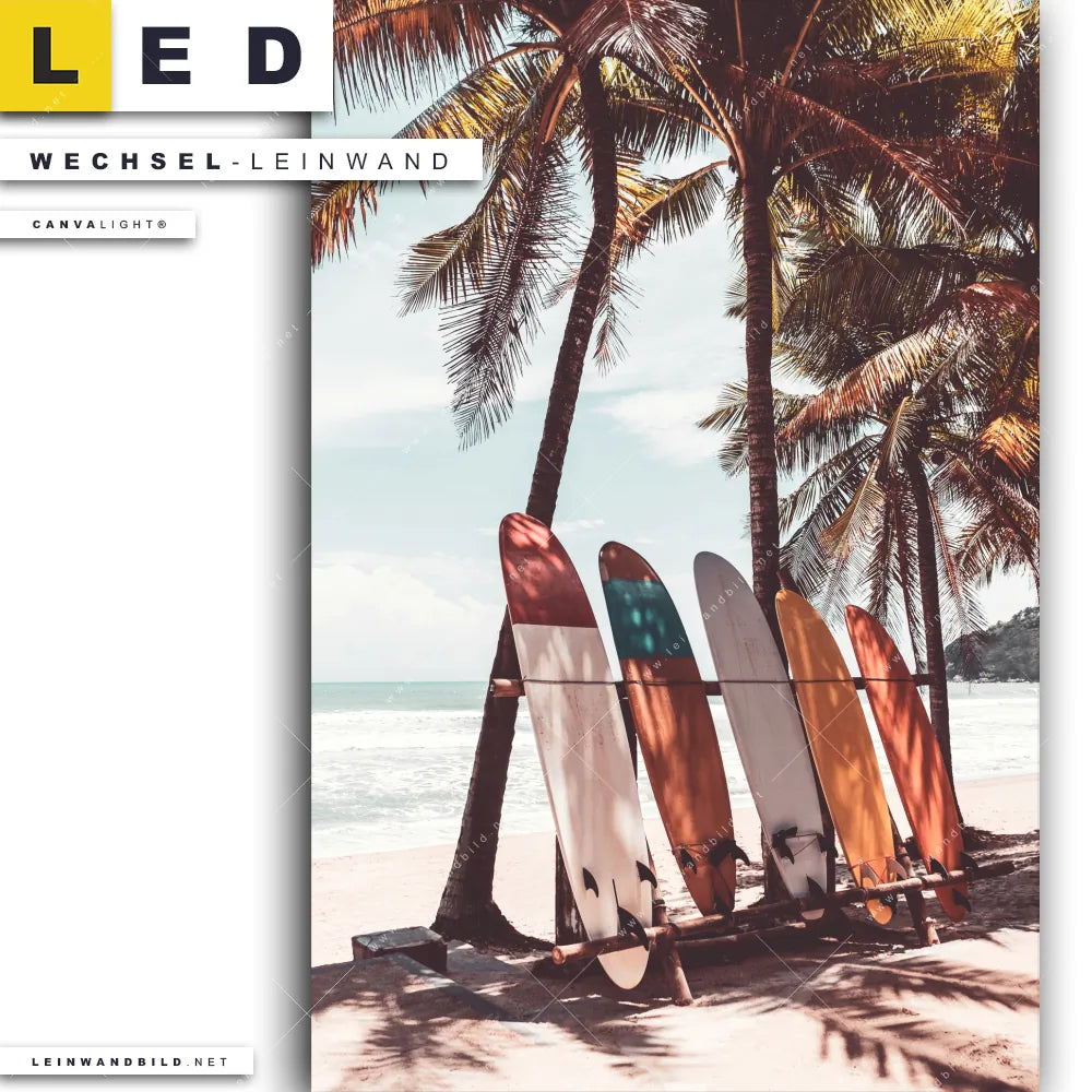 LED Wechsel-Leinwand Canvalight® TEX | Surfbretter und Palmen | Hochformat