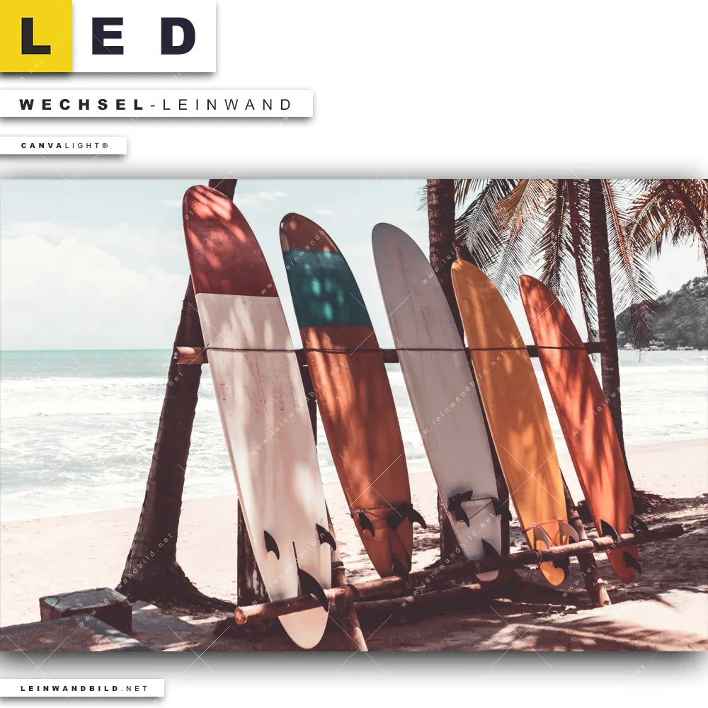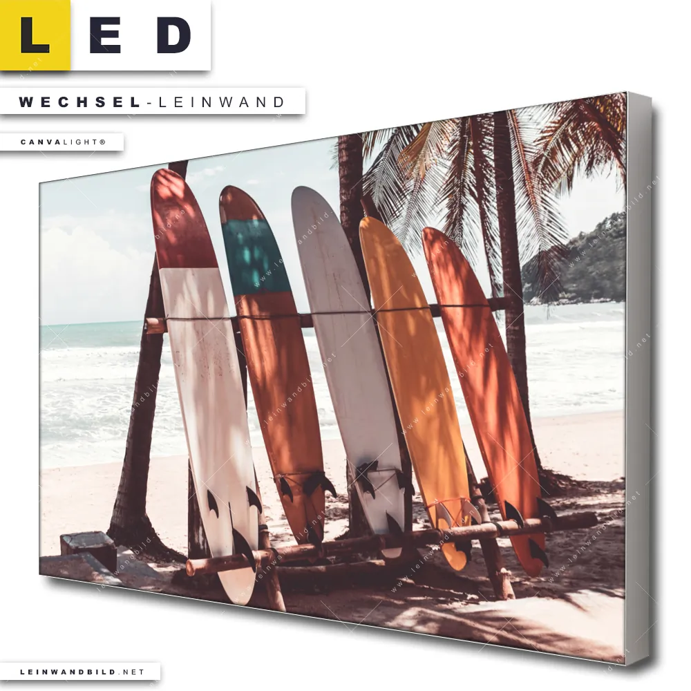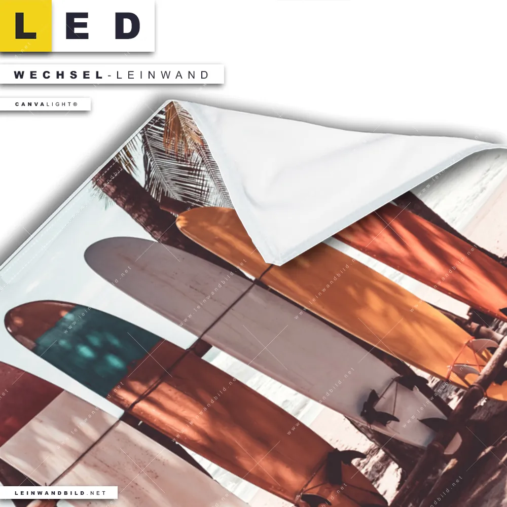 LED Wechsel-Leinwand Canvalight® TEX | Surfbretter und Palmen | Querformat