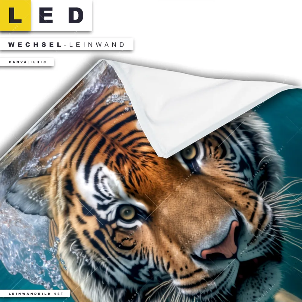 Bitte beachte, dass die Farben, der auf dem Monitor abgebildeten Raubkatze unter Wasser Darstellung, möglicherweise von den Originalfarben deiner Canvalight® TEX Wechsel-Leinwand abweichen können.