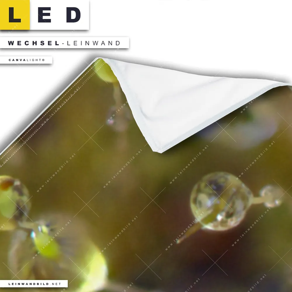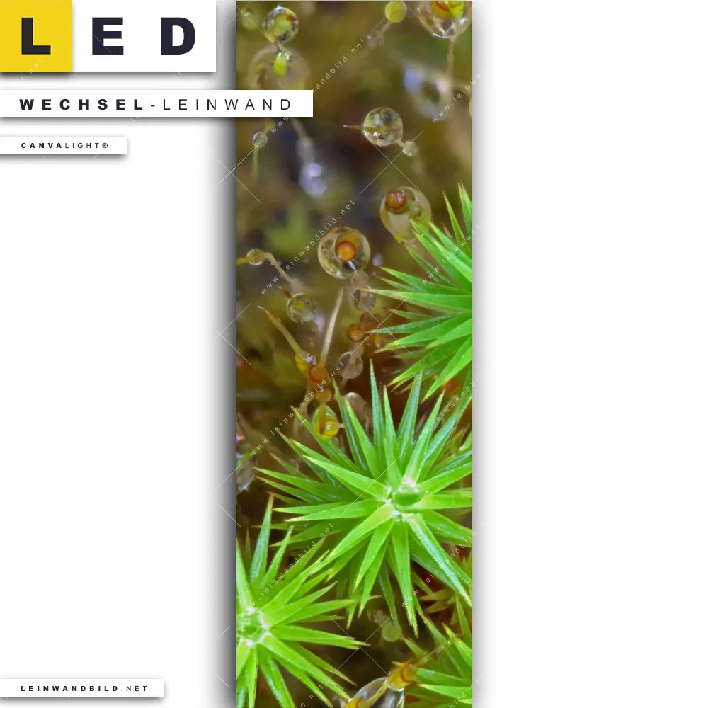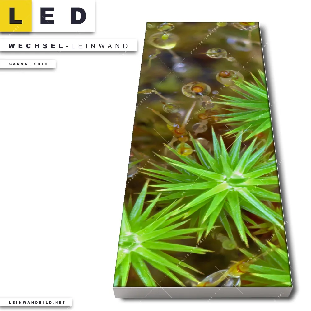 Du konfigurierst Deine individuelle LED Wechsel-Leinwand Canvalight® TEX | Tautropfen auf Moos | Schmal und wir produzieren sie NEU für Dich. Unsere Blumen - Botanik Austausch-Fotoleinwände für Canvalight® LED Bilder sind KEINE Lagerware. Du bist Dir unsicher, welches Motiv oder Format das richtige für dein individuelles LED Wechselmotiv auf Leinwand ist, dann helfen wir dir gerne weiter und beraten dich!