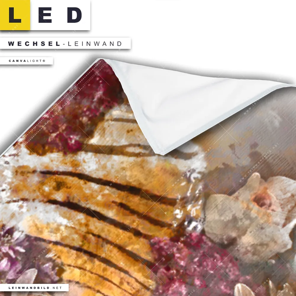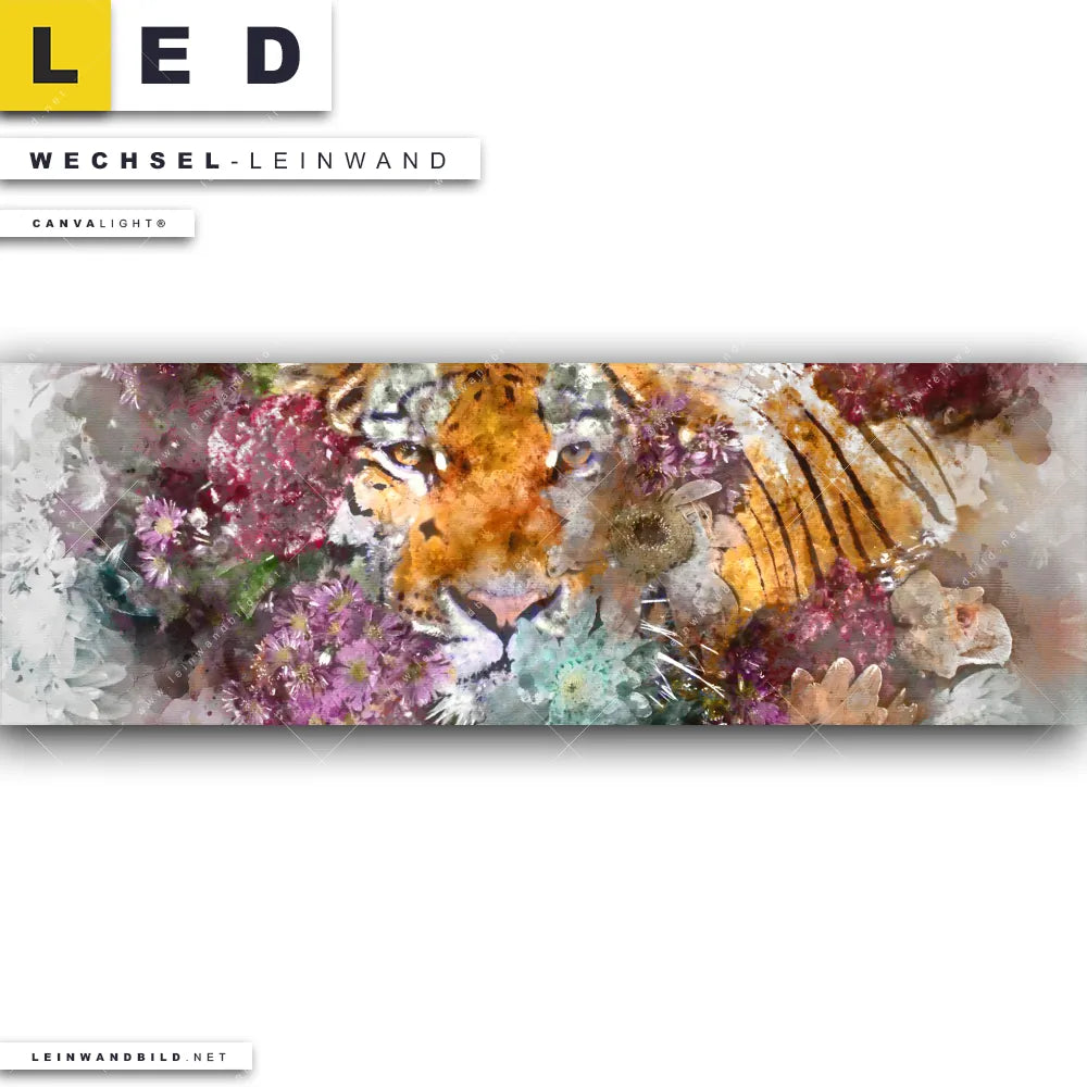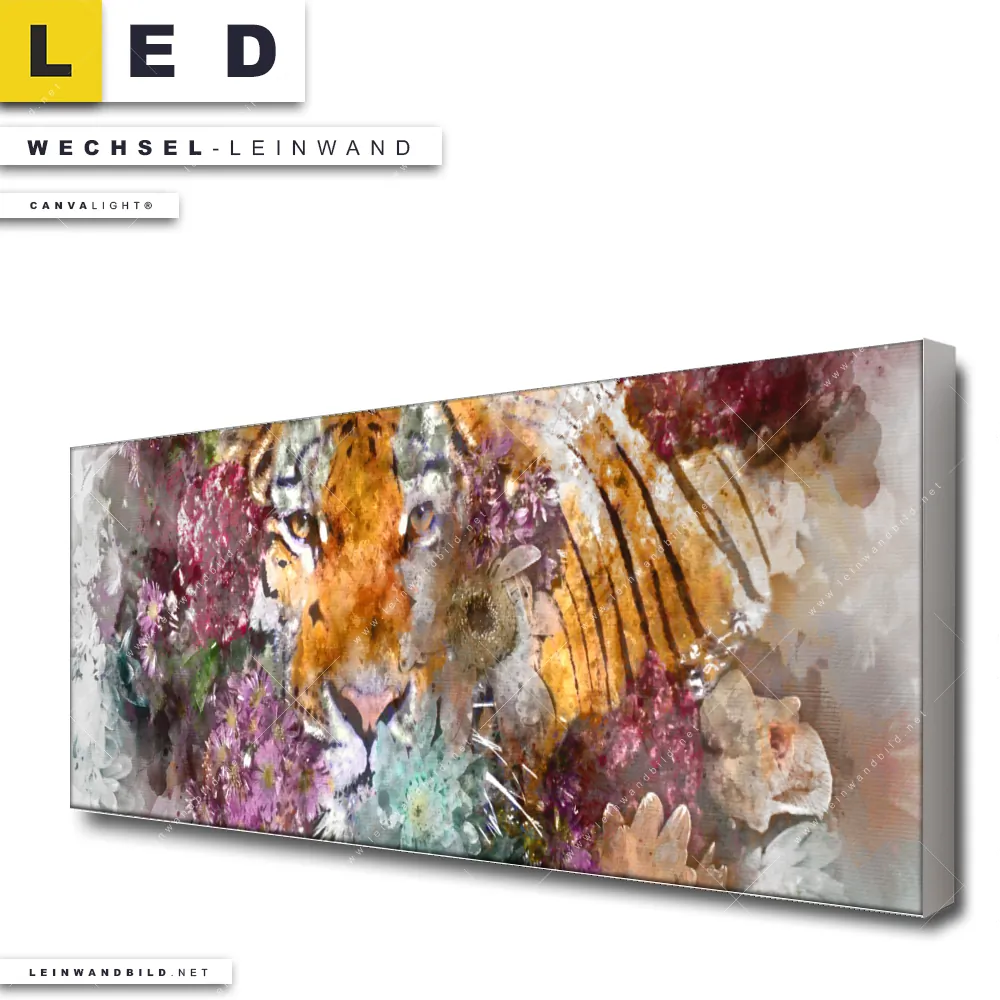 Du bist auf der Suche nach einer Tierwelt, Blumen - Botanik Wechsel-Leinwand für Dein LED-Leinwandbild im Panorama-Format? Begriffe wie Tiere & Blumen, Tier, Blumen, Kunst, Aquarell, Tiger, Raubkatze, Blüten haben Dich auf der Suche nach Deiner Ersatz-Leinwand für dein extra breites LED Wandbild mit wechselbarer Leinwand inspiriert? Farben wie Pink, Beige, Rot, Braun dürfen auf Deinem neuen Wechselmotiv für Dein XXL Leinwand-LED-Bild nicht fehlen und Leinwände im Floral, Modern Art, Surreal - Fantasy Stil für Leuchtbilder passen perfekt zu Deinem Einrichtungsstil?