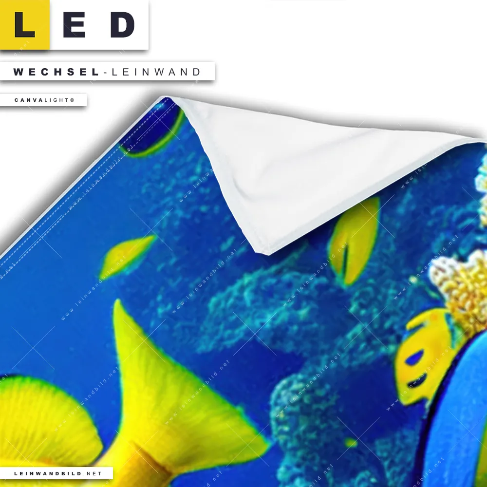Bitte beachte, dass die Farben, der auf dem Monitor abgebildeten Tropische Fische unter Wasser Darstellung, möglicherweise von den Originalfarben deiner Canvalight® TEX Wechsel-Leinwand abweichen können.