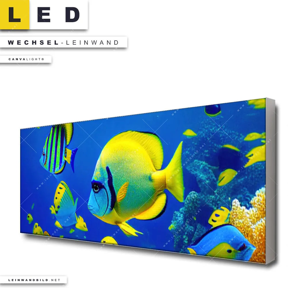 Du bist auf der Suche nach einer Strand - Meer, Tierwelt Wechsel-Leinwand für Dein LED-Leinwandbild im Panorama-Format? Begriffe wie Ozean, Unterwasserwelt, Korallenriff, Korallen, Fische, Riff, Urlaub - Reisen haben Dich auf der Suche nach Deiner Ersatz-Leinwand für dein extra breites LED Wandbild mit wechselbarer Leinwand inspiriert? Farben wie Blau, Orange, Lila dürfen auf Deinem neuen Wechselmotiv für Dein XXL Leinwand-LED-Bild nicht fehlen und Leinwände im Modern Art, Natürlich - Realistisch Stil für Leuchtbilder passen perfekt zu Deinem Einrichtungsstil?