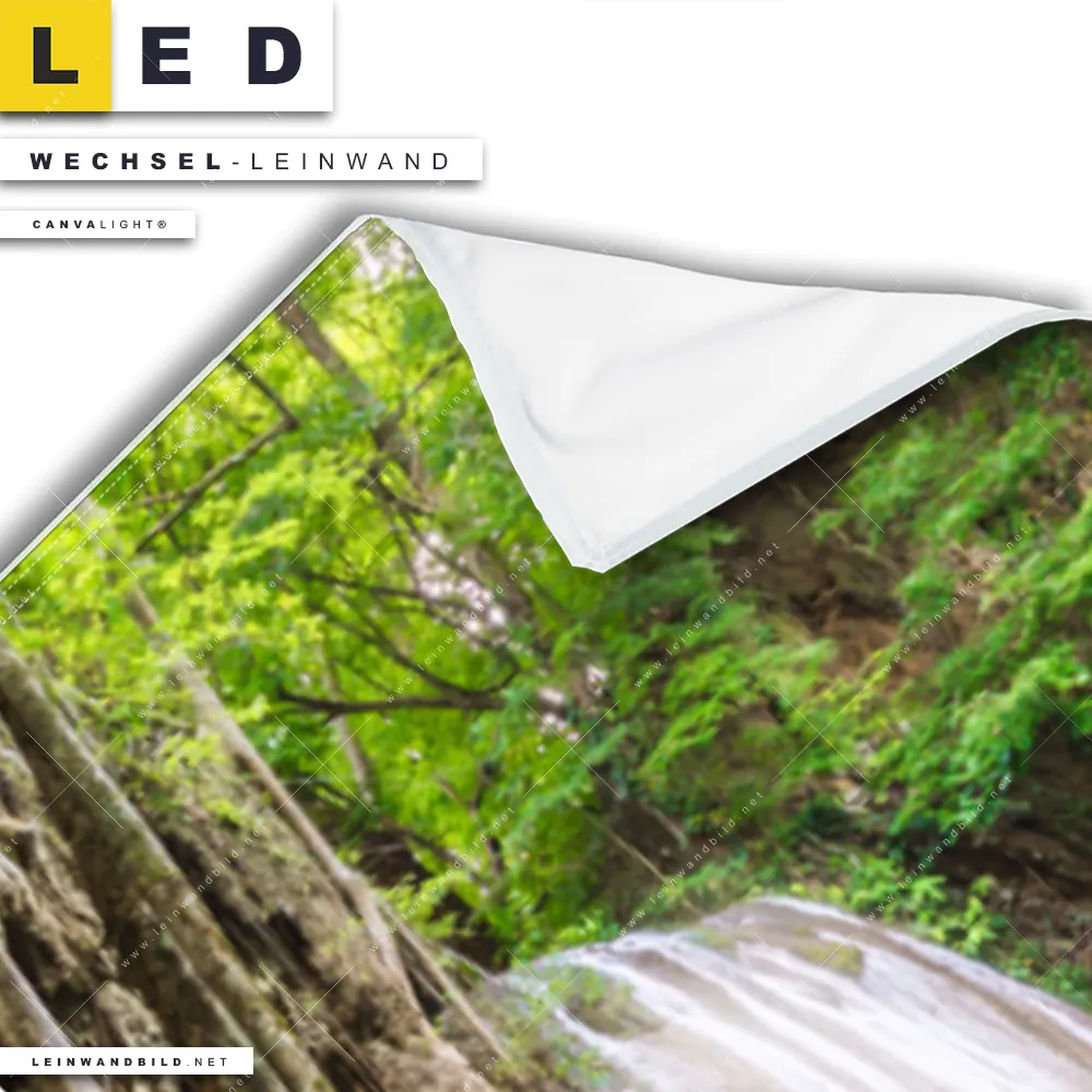 Bitte beachte, dass die Farben, der auf dem Monitor abgebildeten Wasserfall im Wald Darstellung, möglicherweise von den Originalfarben deiner Canvalight® TEX Wechsel-Leinwand abweichen können.