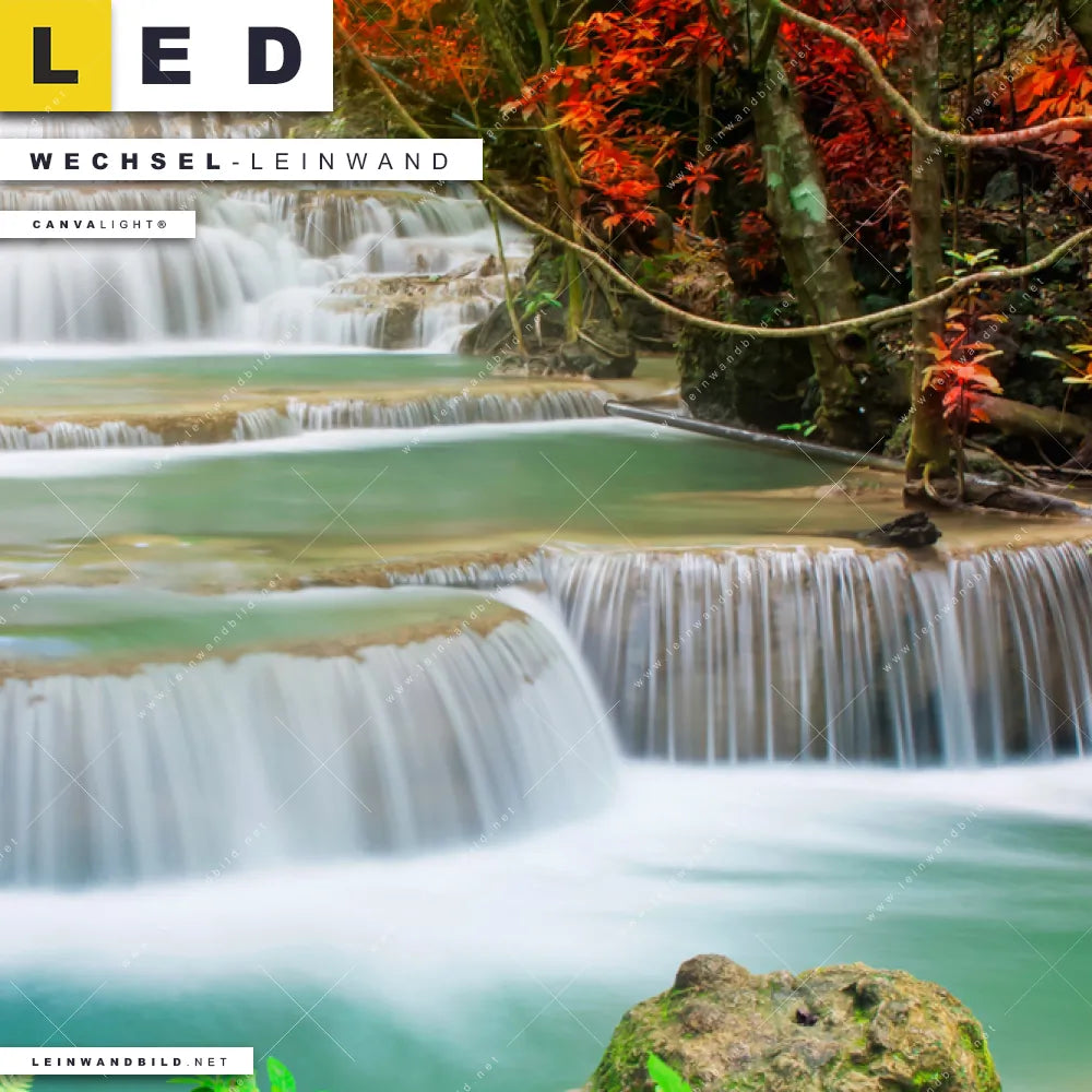 Bitte beachte, dass die Farben, der auf dem Monitor abgebildeten Wasserfälle im Herbstwald Darstellung, möglicherweise von den Originalfarben deiner Canvalight® TEX Wechsel-Leinwand abweichen können.