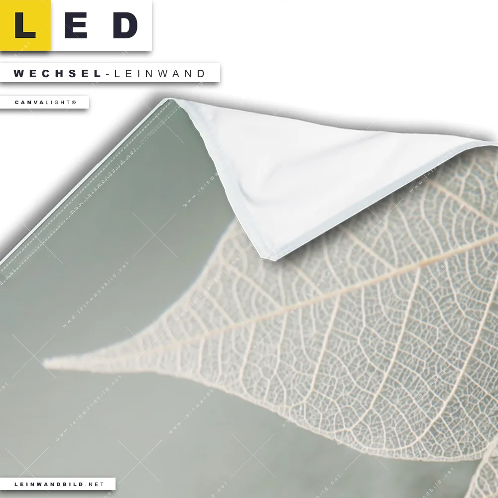 Du konfigurierst Deine individuelle LED Wechsel-Leinwand Canvalight® TEX | Weiße Blätter | Hochformat und wir produzieren sie NEU für Dich. Unsere Muster - Texturen, Blumen - Botanik Austausch-Fotoleinwände für Canvalight® LED Bilder sind KEINE Lagerware. Du bist Dir unsicher, welches Motiv oder Format das richtige für dein individuelles LED Wechselmotiv auf Leinwand ist, dann helfen wir dir gerne weiter und beraten dich!