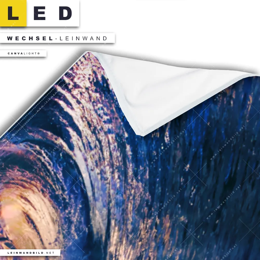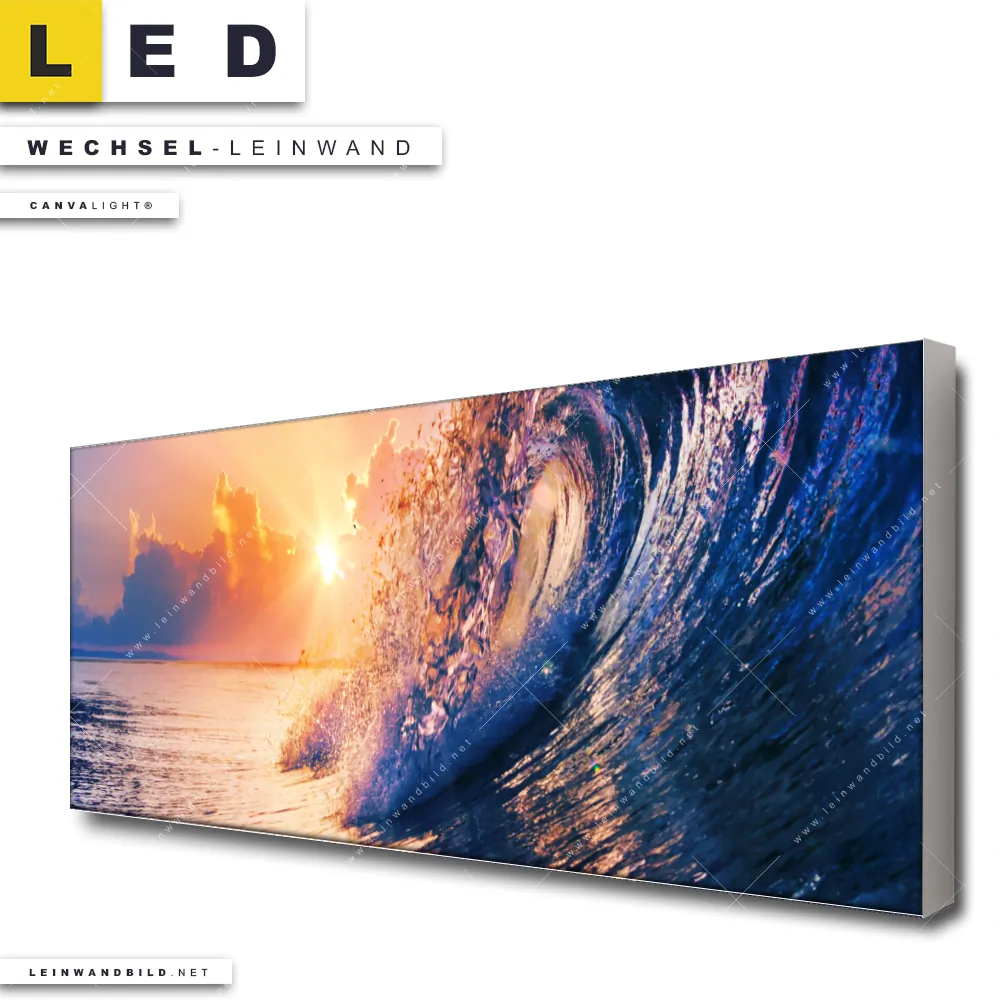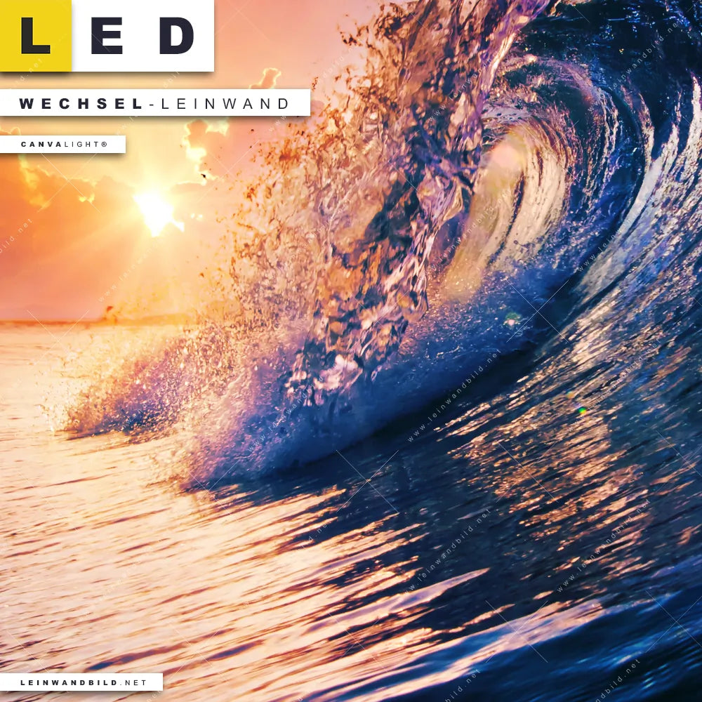 Du konfigurierst Deine individuelle LED Wechsel-Leinwand Canvalight® TEX | Welle im Sonnenuntergang | Panorama und wir produzieren sie NEU für Dich. Unsere Landschaften, Strand - Meer Austausch-Fotoleinwände für Canvalight® LED Bilder sind KEINE Lagerware. Du bist Dir unsicher, welches Motiv oder Format das richtige für dein individuelles LED Wechselmotiv auf Leinwand ist, dann helfen wir dir gerne weiter und beraten dich!