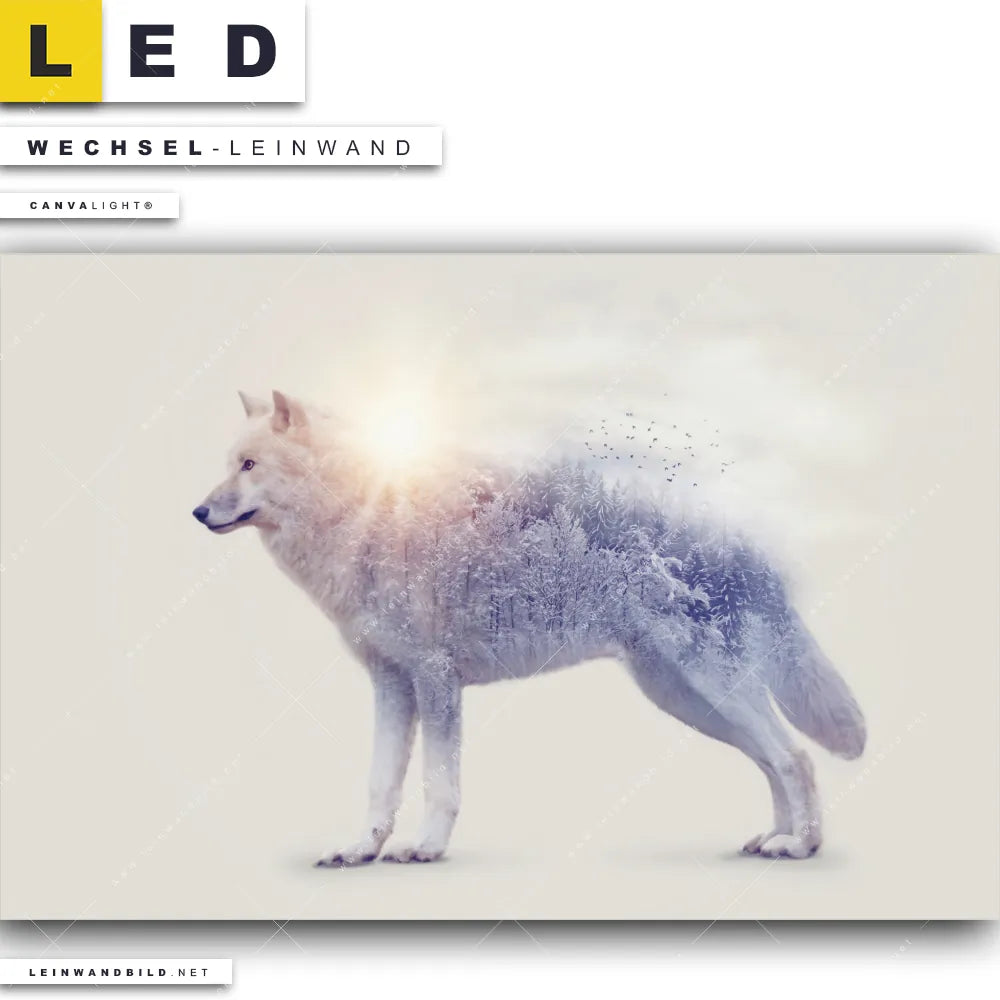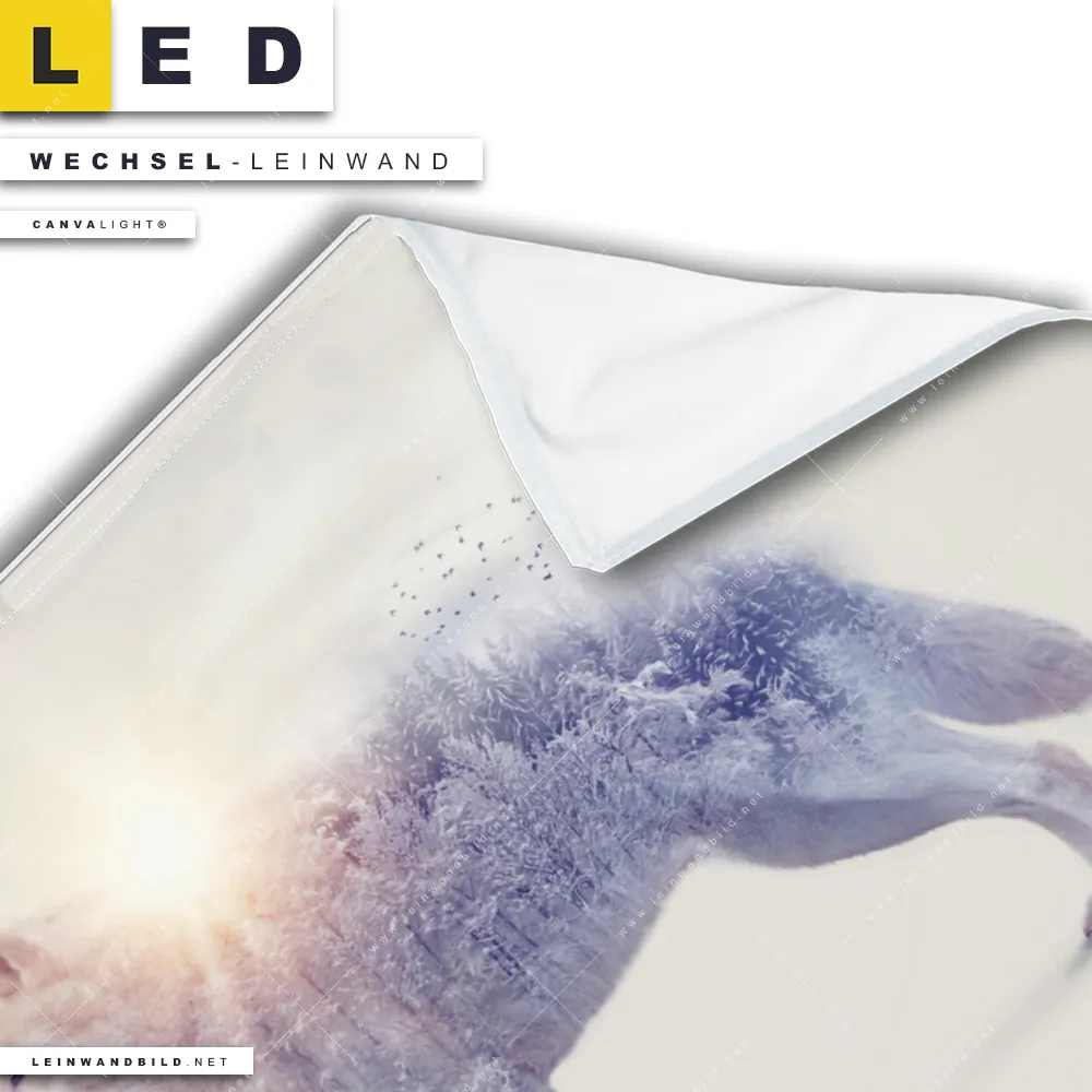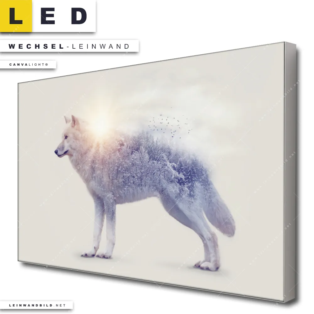 Du bist auf der Suche nach einer Tierwelt Wechsel-Leinwand für Dein LED-Leinwandbild im Querformat? Begriffe wie Wolf, Wald, Doppelbelichtung, Natur, skandinavisch, Bäume, Sonne, Sonnenlicht haben Dich auf der Suche nach Deiner Ersatz-Leinwand für dein breites LED Wandbild mit wechselbarer Leinwand inspiriert? Farben wie Beige dürfen auf Deinem neuen Wechselmotiv für Dein XXL Leinwand-LED-Bild nicht fehlen und Leinwände im Modern Art, Mixed Media Stil für Leuchtbilder passen perfekt zu Deinem Einrichtungsstil?