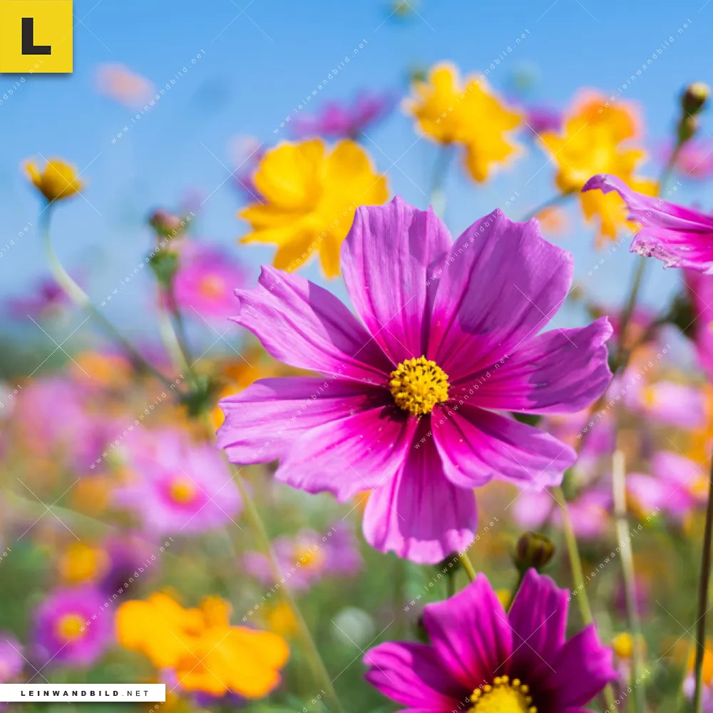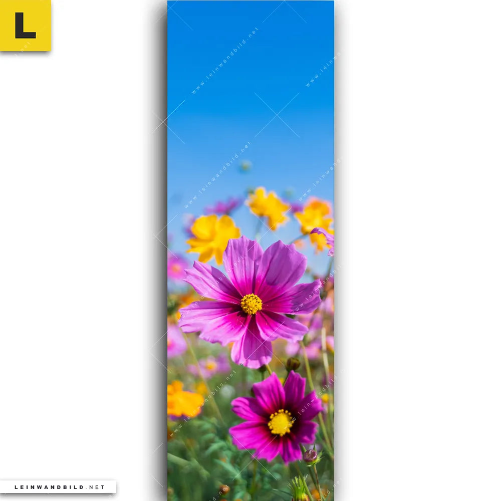 Du konfigurierst Dein individuelles Leinwandbild | Blumenwiese unter blauem Himmel | Schmal und wir produzieren es NEU für Dich. Unsere Landschaften, Blumen - Botanik Leinwände sind KEINE Lagerware. Du bist Dir unsicher, welches Motiv oder Format das richtige für dein individuelles Keilrahmenbild ist, dann helfen wir dir gerne weiter und beraten dich!
