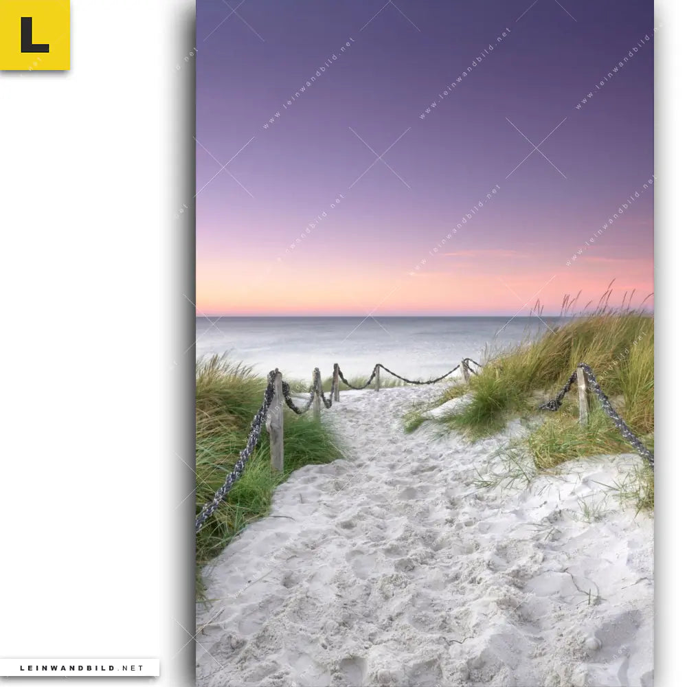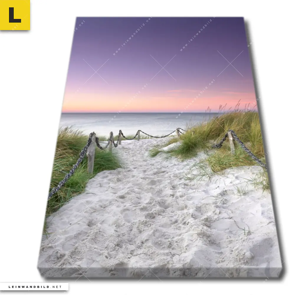 Du konfigurierst Dein individuelles Leinwandbild | Strandweg im Sonnenuntergang | Hochformat und wir produzieren es NEU für Dich. Unsere Landschaften, Strand - Meer Leinwände sind KEINE Lagerware. Du bist Dir unsicher, welches Motiv oder Format das richtige für dein individuelles Keilrahmenbild ist, dann helfen wir dir gerne weiter und beraten dich!