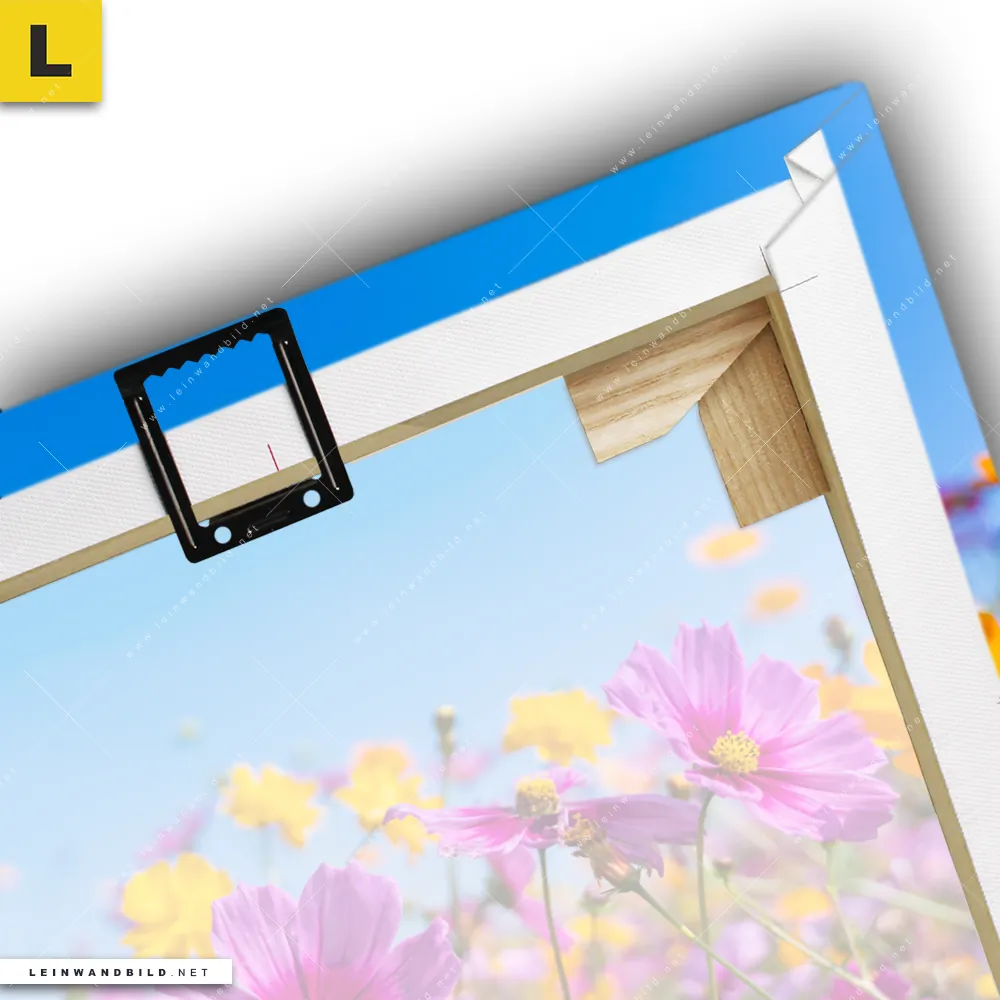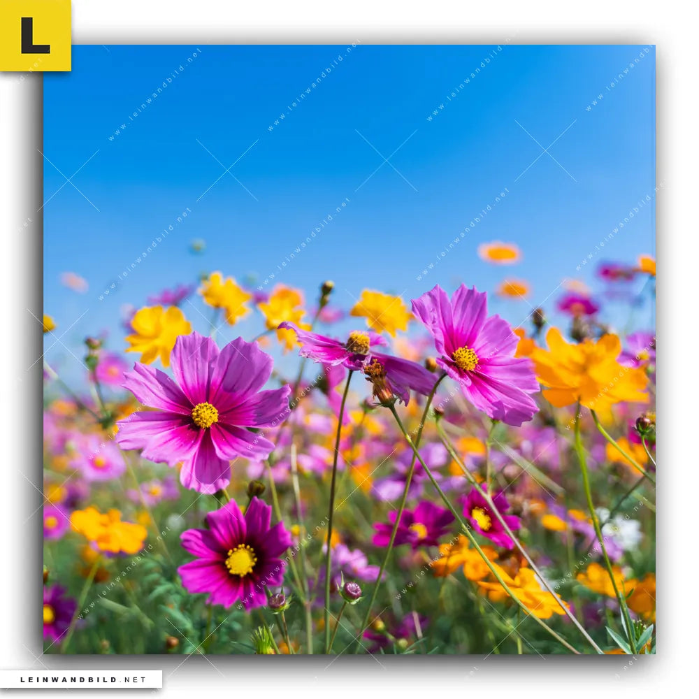 Du konfigurierst Dein individuelles Leinwandbild | Blumenwiese unter blauem Himmel | Quadrat und wir produzieren es NEU für Dich. Unsere Landschaften, Blumen - Botanik Leinwände sind KEINE Lagerware. Du bist Dir unsicher, welches Motiv oder Format das richtige für dein individuelles Keilrahmenbild ist, dann helfen wir dir gerne weiter und beraten dich!