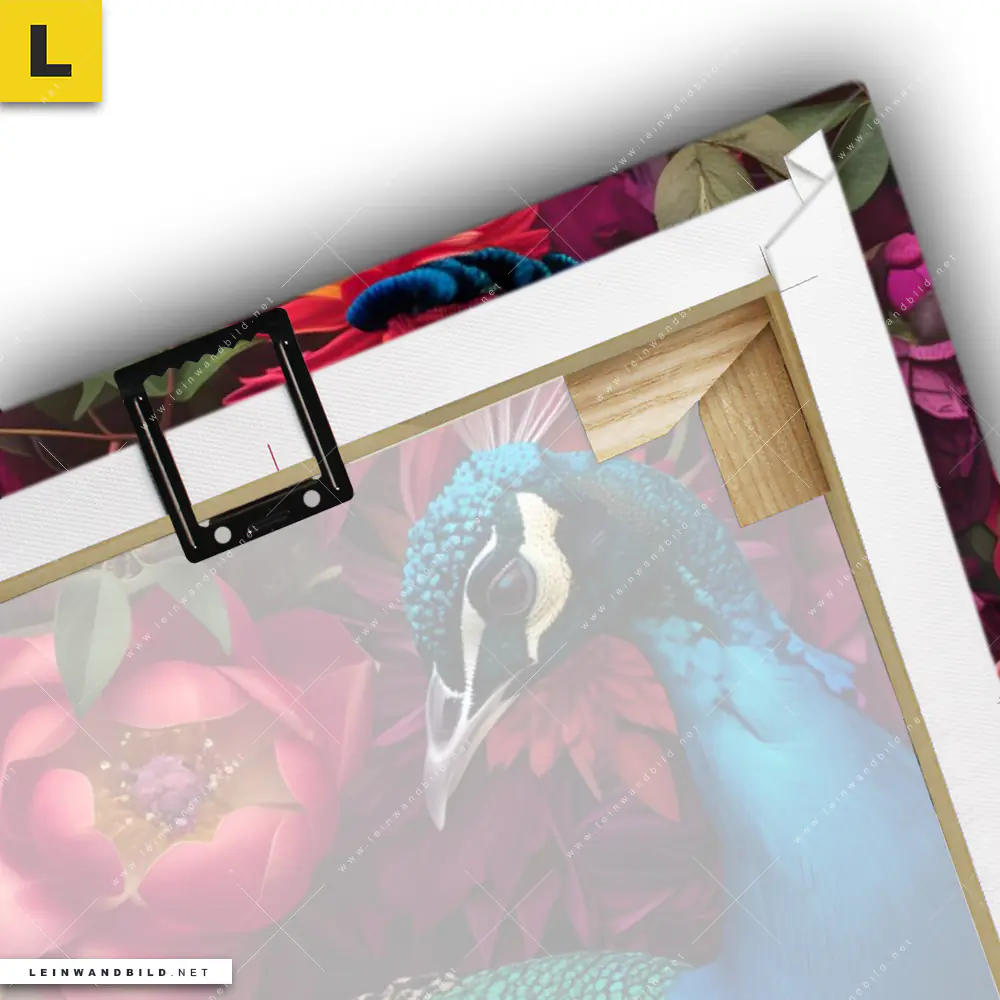 Du konfigurierst Dein individuelles Leinwandbild | Prachtvoller Pfau und Blüten | Hochformat und wir produzieren es NEU für Dich. Unsere Tierwelt, Blumen - Botanik Leinwände sind KEINE Lagerware. Du bist Dir unsicher, welches Motiv oder Format das richtige für dein individuelles Keilrahmenbild ist, dann helfen wir dir gerne weiter und beraten dich!
