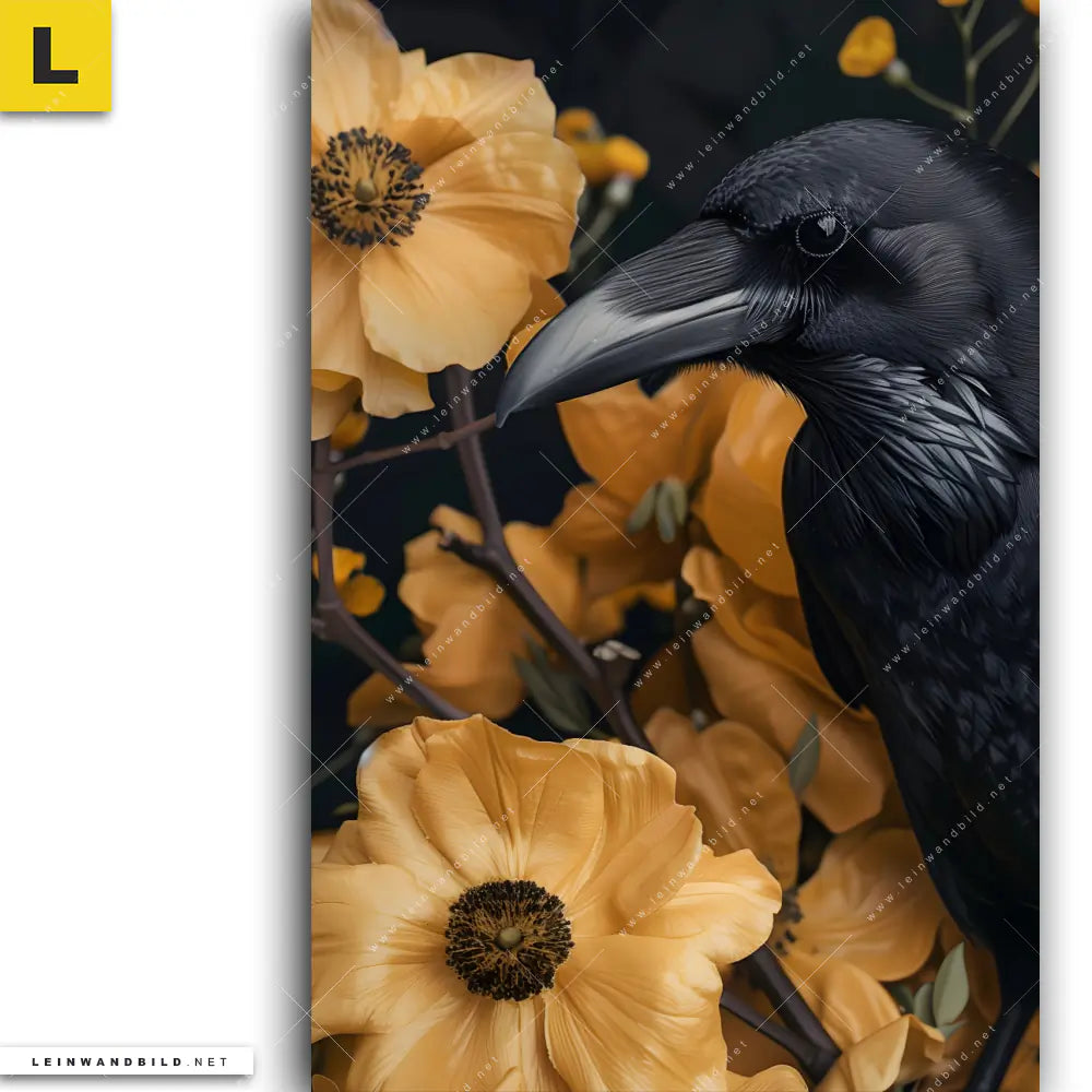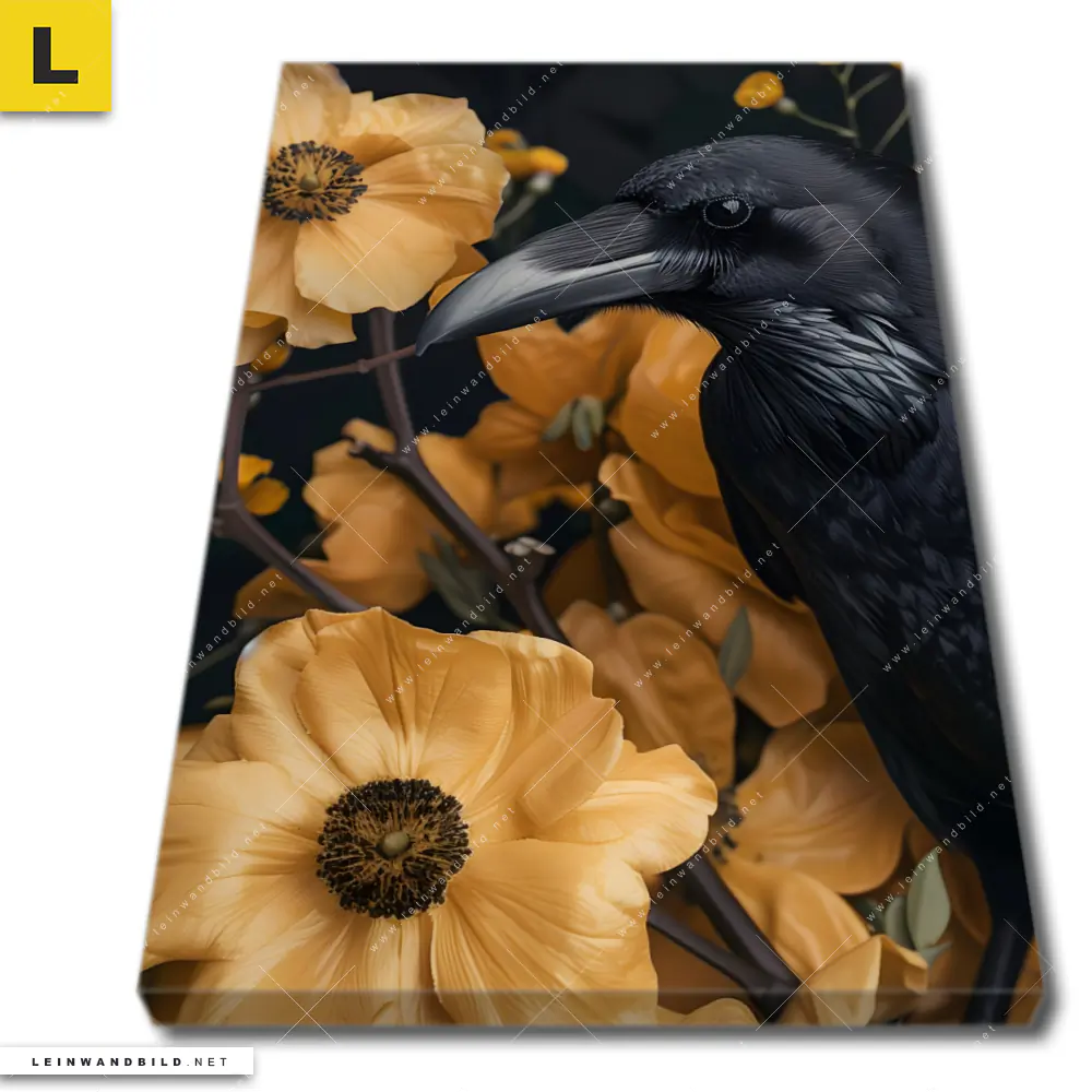 Leinwandbild | Naturbild - Rabe & Blüten | Hochformat