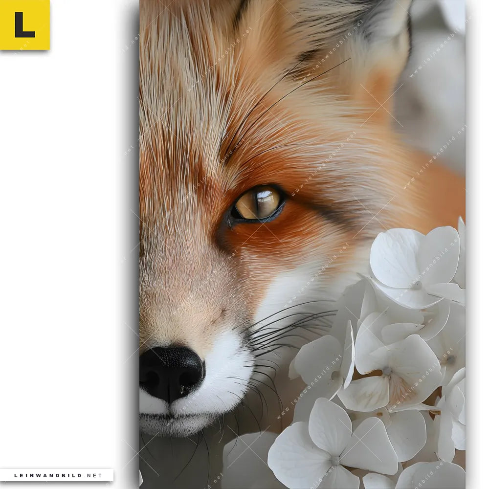 Leinwandbild | Friedlicher Fuchs und Blumen | Hochformat