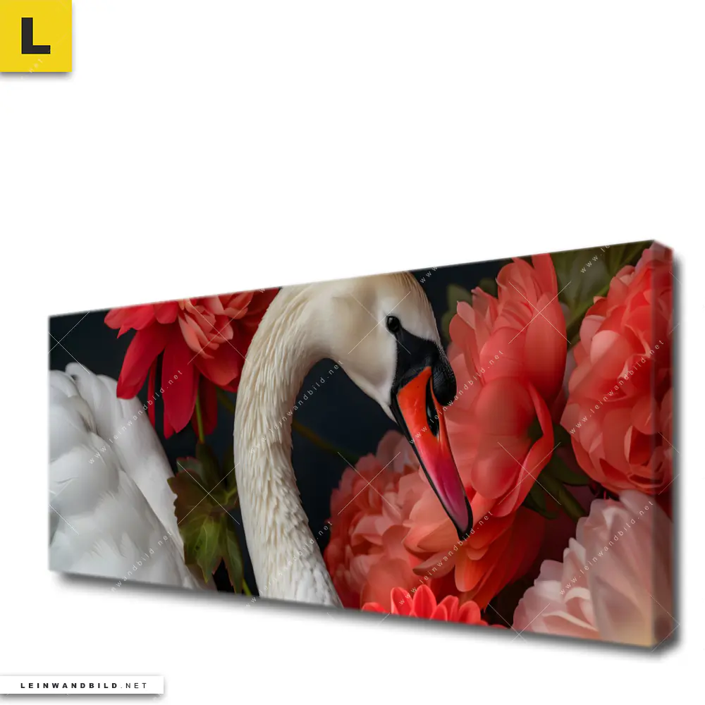 Leinwandbild | Eleganter Schwan mit Blumen | Panorama
