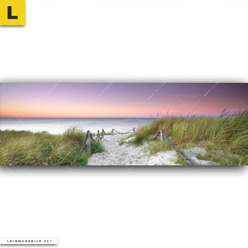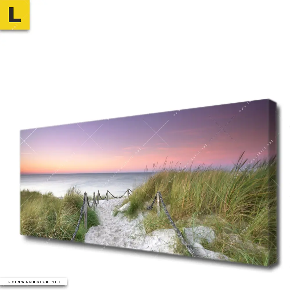 Du konfigurierst Dein individuelles Leinwandbild | Strandweg im Sonnenuntergang | Panorama und wir produzieren es NEU für Dich. Unsere Landschaften, Strand - Meer Leinwände sind KEINE Lagerware. Du bist Dir unsicher, welches Motiv oder Format das richtige für dein individuelles Keilrahmenbild ist, dann helfen wir dir gerne weiter und beraten dich!