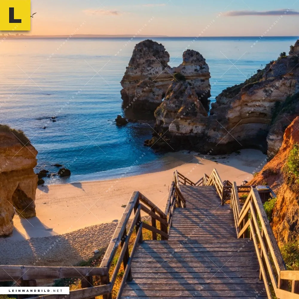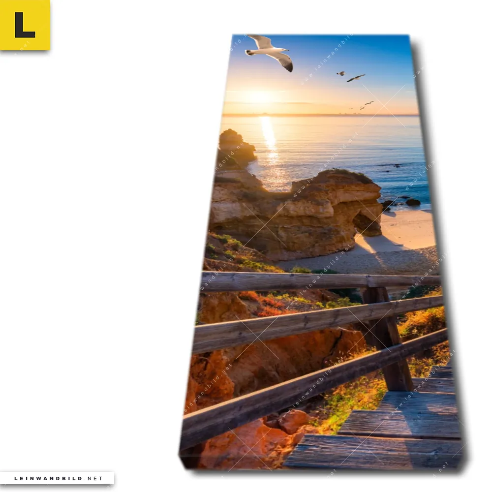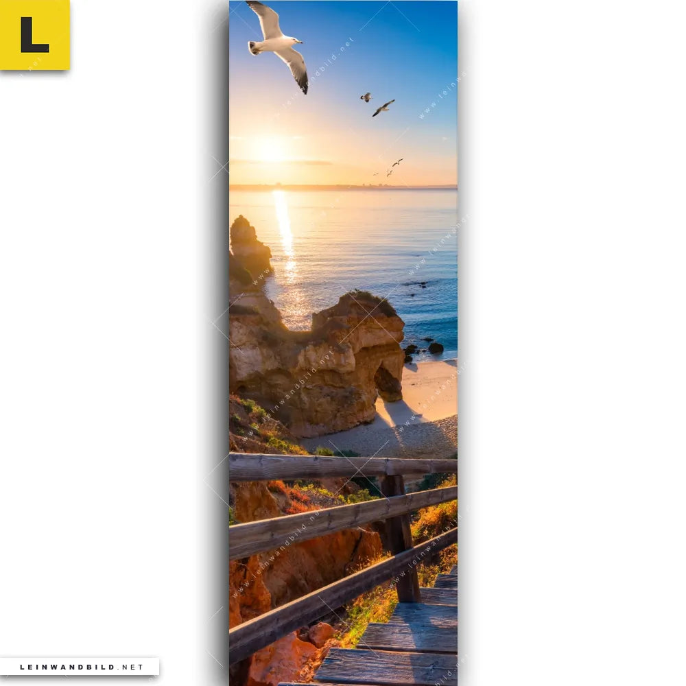 Du bist auf der Suche nach einem XXL Landschaften, Strand - Meer Leinwandbild und Begriffe wie Treppe, Möwe, Vogel, Deutschland, Sommer, Weg, Ostsee - Nordsee, Urlaub - Reisen, Sonnenuntergang - Sonnenaufgang, Steg haben Dich auf der Suche nach Deinem neuen Schmalen Wandbild auf Leinwand inspiriert? Farben wie Beige, Blau, Braun, Grün dürfen auf Deinem neuen Keilrahmenbild im Panorama-Hochformat nicht fehlen und Leinwände im Natürlich - Realistisch Stil passen perfekt zu Deinem Einrichtungsstil?