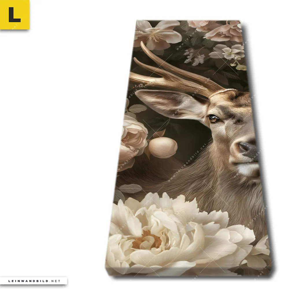 Du konfigurierst Dein individuelles Leinwandbild | Romantischer Hirsch mit Blumen | Schmal und wir produzieren es NEU für Dich. Unsere Tierwelt, Blumen - Botanik Leinwände sind KEINE Lagerware. Du bist Dir unsicher, welches Motiv oder Format das richtige für dein individuelles Keilrahmenbild ist, dann helfen wir dir gerne weiter und beraten dich!