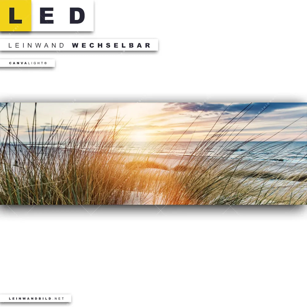 Du bist auf der Suche nach einem Landschaften, Strand - Meer LED Leinwandbild im Panorama-Format? Begriffe wie Deutschland, Sommer, Ostsee - Nordsee, Urlaub - Reisen, Sonnenuntergang - Sonnenaufgang, Dünen, Gräser, Frühling haben Dich auf der Suche nach Deinem neuen XXL LED Wandbild mit wechselbarer Leinwand inspiriert? Farben wie Grün, Beige, Blau dürfen auf Deinem neuen extra breiten Leinwand-LED-Bild nicht fehlen und Leuchtbilder im Natürlich - Realistisch, Retro - Vintage Stil passen perfekt zu Deinem Einrichtungsstil?