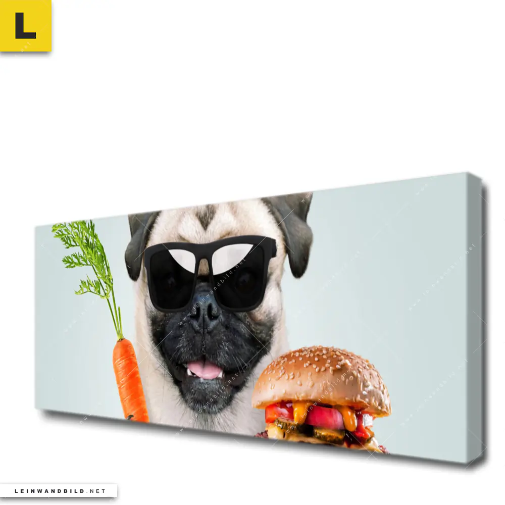 Du konfigurierst Dein individuelles Leinwandbild | Lustiger Hund mit Burger | Panorama und wir produzieren es NEU für Dich. Unsere Tierwelt, Essen - Trinken Leinwände sind KEINE Lagerware. Du bist Dir unsicher, welches Motiv oder Format das richtige für dein individuelles Keilrahmenbild ist, dann helfen wir dir gerne weiter und beraten dich!