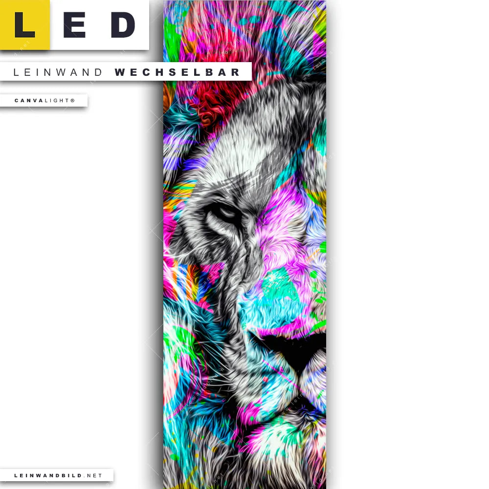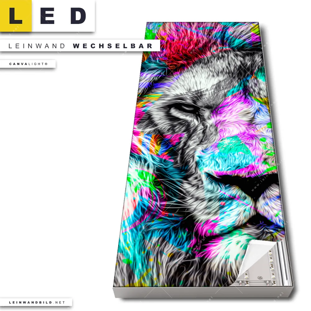 Du bist auf der Suche nach einem Tierwelt LED Leinwandbild im Schmalen Format? Begriffe wie Raubkatze, Löwe, Afrika, Dschungel, Lion, Farbexplosion, Farbspritzer, Farbe, Porträt haben Dich auf der Suche nach Deinem neuen XXL LED Wandbild mit wechselbarer Leinwand inspiriert? Farben wie Bunt, Weiss dürfen auf Deinem neuen Leinwand-LED-Bild im Panorama-Hochformat nicht fehlen und Leuchtbilder im Abstrakt, Modern Art, Pop Art Stil passen perfekt zu Deinem Einrichtungsstil?