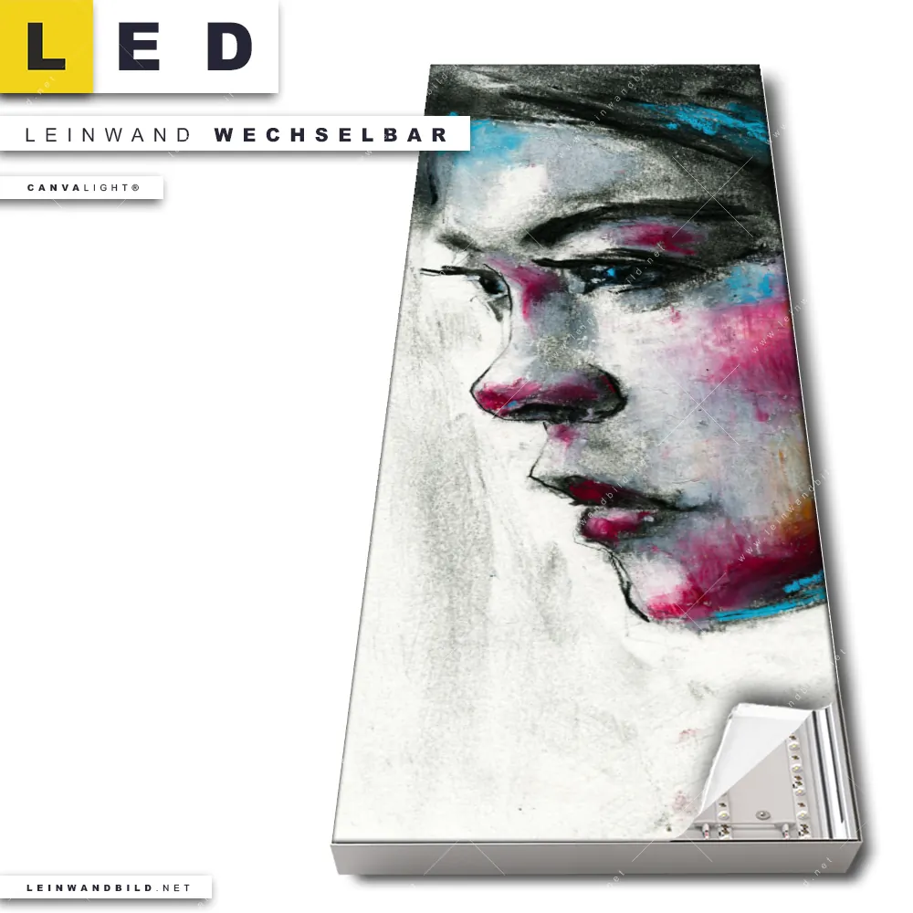 Dann sollte das LED Leinwandbild Canvalight® TEX | Schönes Mädchen | Schmal den Weg zu Dir finden. Das stufenlos dimmbare Leinwandbild Zeichnung Seitenprofil einer Frau im steckerfertigen Leuchtrahmen mit Fernbedienung und optionaler Farbtemperatursteuerung fügt sich als Eye-Catcher harmonisch in jedes Wohnzimmer - Schlafzimmer, Bar - Gastronomie, Friseur - Beauty Raumkonzept ein.