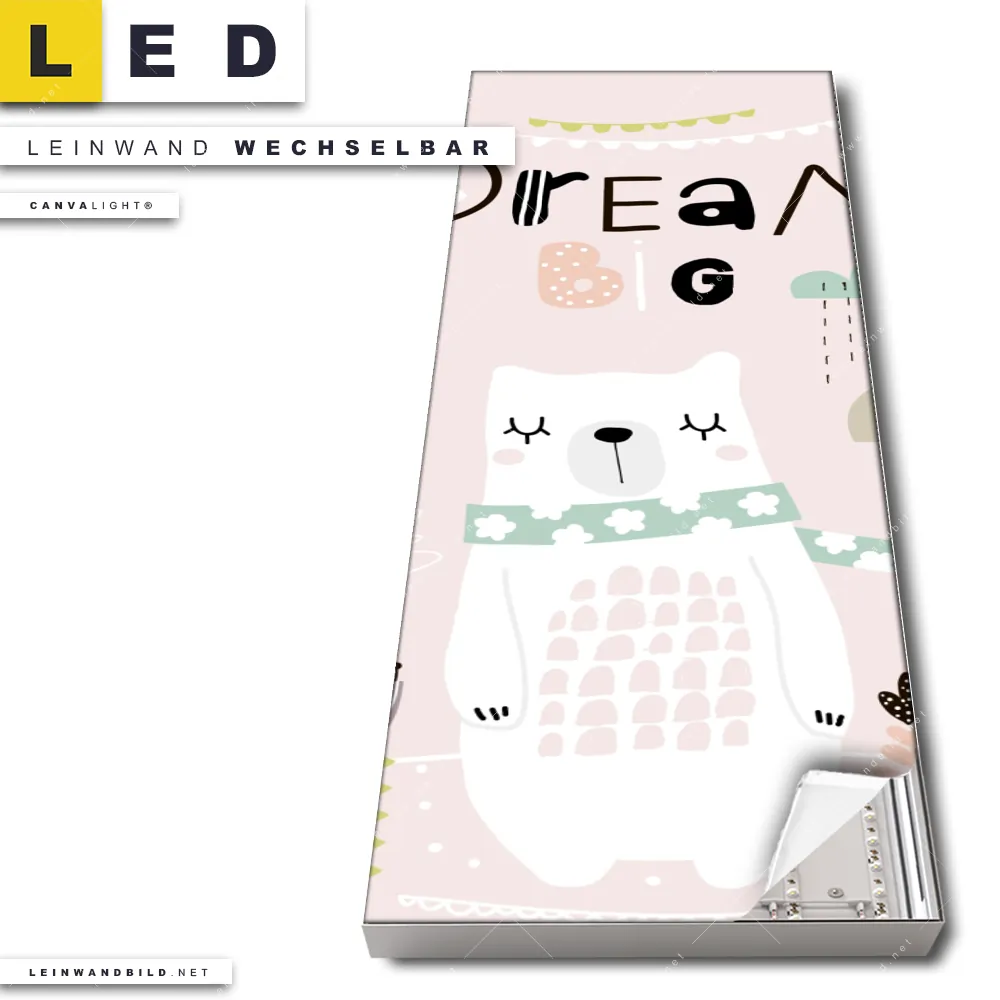 Dann sollte das LED Leinwandbild Canvalight® TEX | Dream Big Eisbär | Schmal den Weg zu Dir finden. Das stufenlos dimmbare Leinwandbild weißer Bär mit Spruch im steckerfertigen Leuchtrahmen mit Fernbedienung und optionaler Farbtemperatursteuerung fügt sich als Eye-Catcher harmonisch in jedes Kinderzimmer, Arzt - Praxis, Friseur - Beauty Raumkonzept ein.