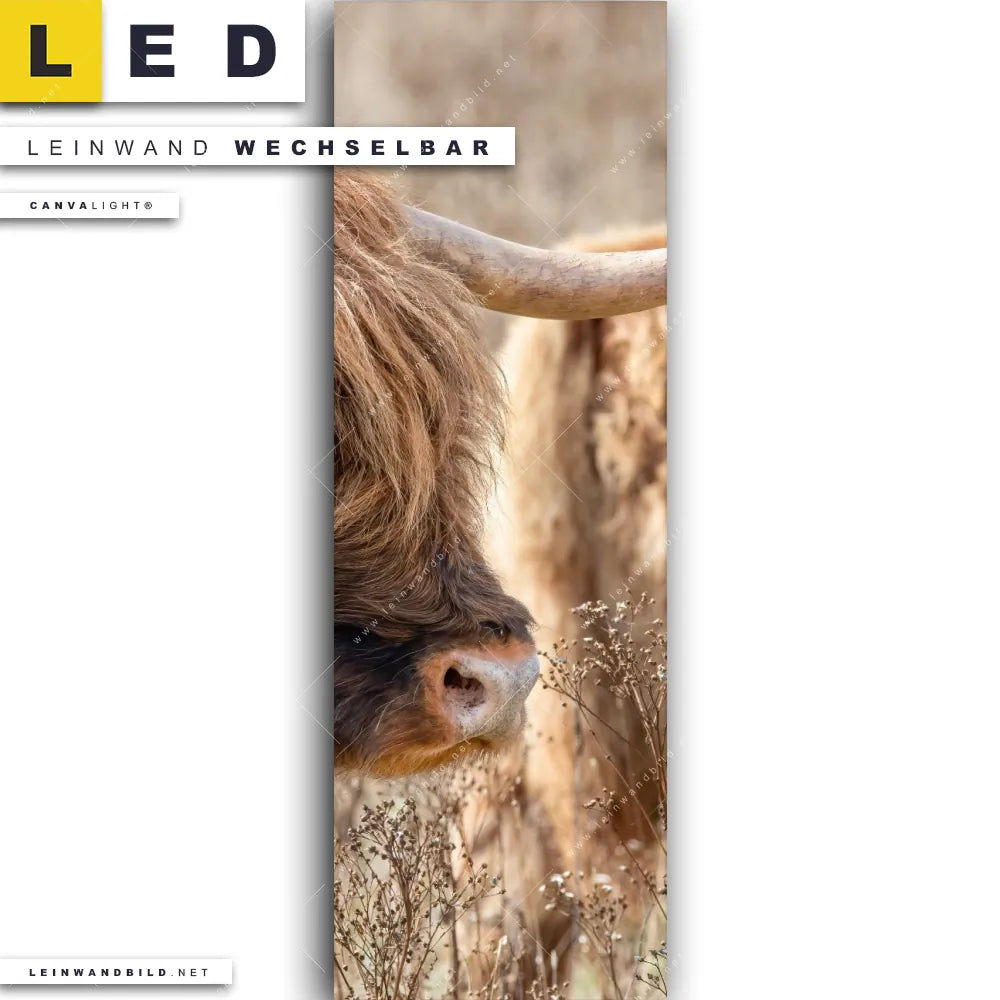 Du bist auf der Suche nach einem Tierwelt LED Leinwandbild im Schmalen Format? Begriffe wie Rind, Hochlandkuh, Hörner, Bulle, Stier haben Dich auf der Suche nach Deinem neuen XXL LED Wandbild mit wechselbarer Leinwand inspiriert? Farben wie Braun, Beige dürfen auf Deinem neuen Leinwand-LED-Bild im Panorama-Hochformat nicht fehlen und Leuchtbilder im Natürlich - Realistisch Stil passen perfekt zu Deinem Einrichtungsstil?