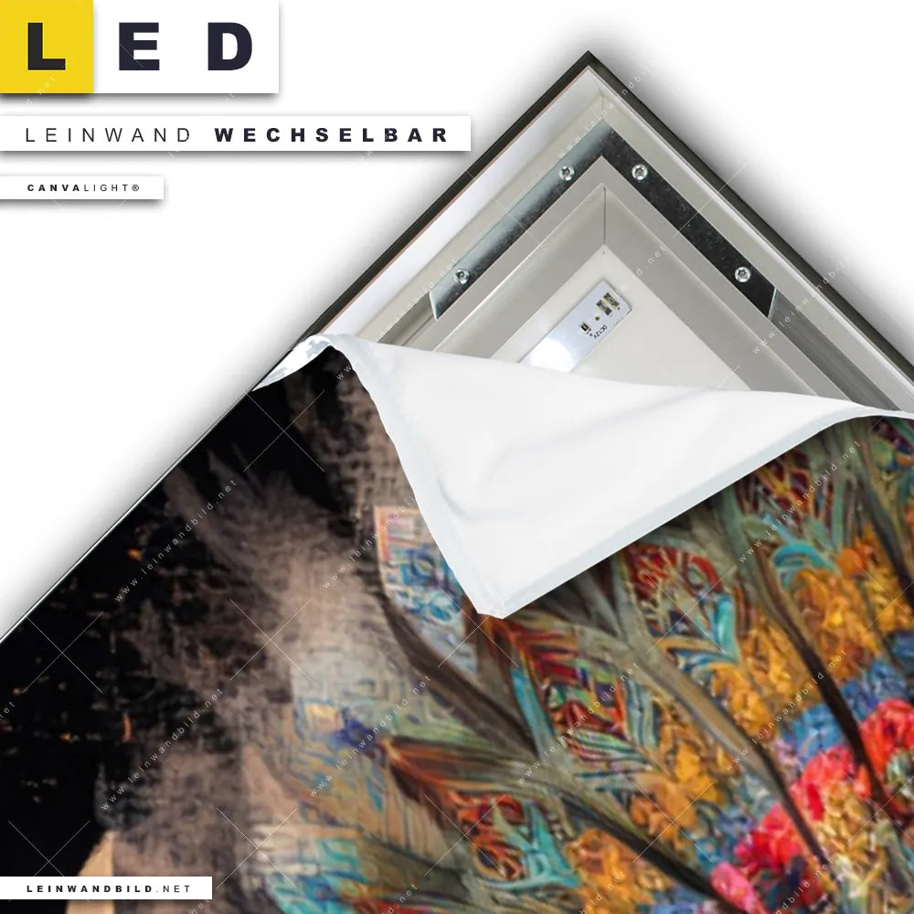 Du konfigurierst Dein individuelles LED Leinwandbild Canvalight® TEX | Löwenkopf mit bunten Federn | Schmal und wir produzieren es NEU für Dich. Unsere Tierwelt LED Bilder mit wechselbarer Textil-Leinwand sind KEINE Lagerware. Du bist Dir unsicher, welches Motiv oder Format das richtige für dein individuelles Canvalight® Leuchtbild ist, dann helfen wir dir gerne weiter und beraten dich!