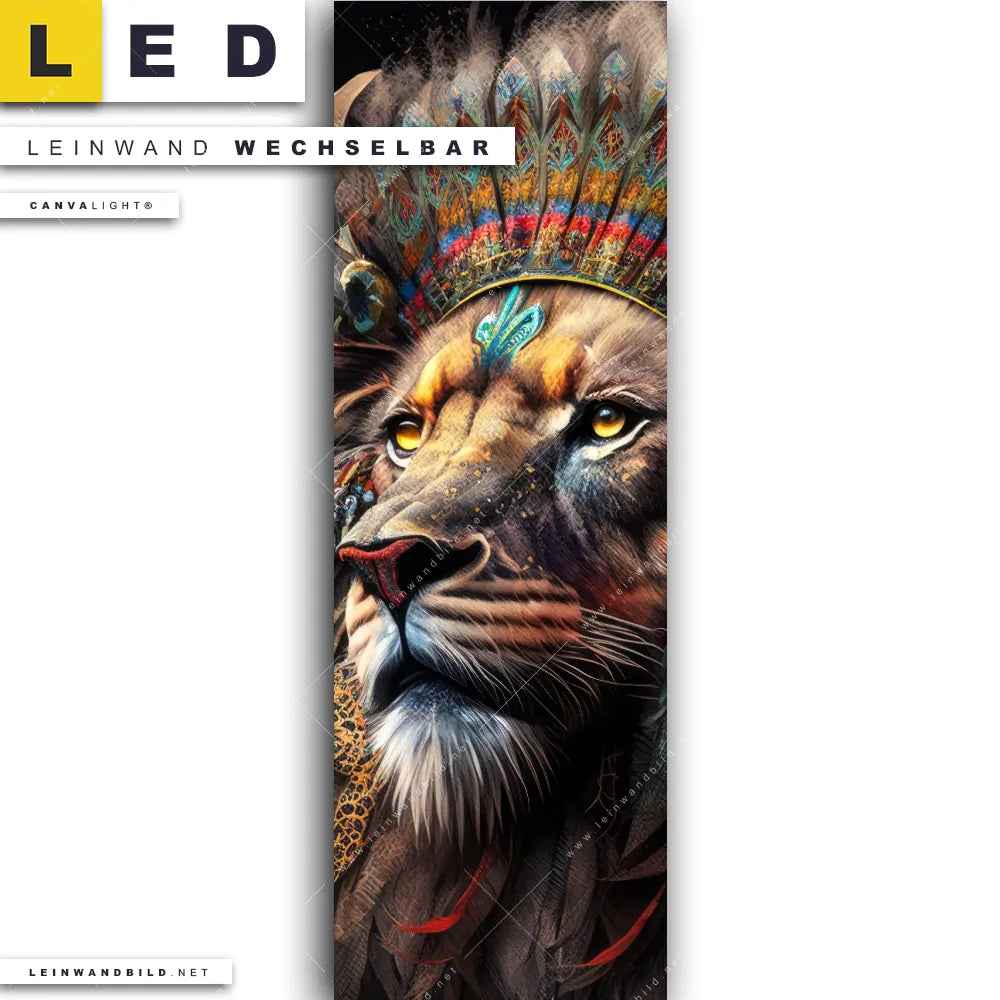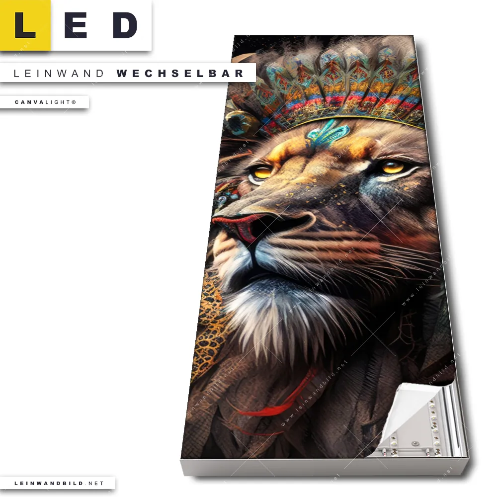 Du bist auf der Suche nach einem Tierwelt LED Leinwandbild im Schmalen Format? Begriffe wie Raubkatze, Löwe, Afrika, Dschungel, Lion, Federn, Indianer, Häuptling, Kopfschmuck, Porträt haben Dich auf der Suche nach Deinem neuen XXL LED Wandbild mit wechselbarer Leinwand inspiriert? Farben wie Schwarz, Bunt dürfen auf Deinem neuen Leinwand-LED-Bild im Panorama-Hochformat nicht fehlen und Leuchtbilder im Modern Art Stil passen perfekt zu Deinem Einrichtungsstil?