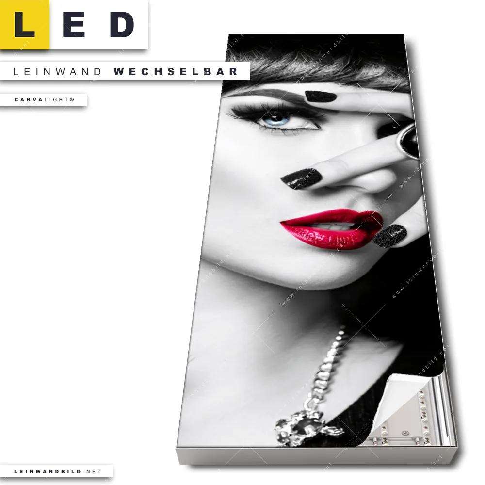 Du bist auf der Suche nach einem Porträts - Menschen LED Leinwandbild im Schmalen Format? Begriffe wie Frau, Lippen, Mund, Porträt, modern, Beauty, Schönheit, Mädchen haben Dich auf der Suche nach Deinem neuen XXL LED Wandbild mit wechselbarer Leinwand inspiriert? Farben wie Schwarz, Weiss, Rot dürfen auf Deinem neuen Leinwand-LED-Bild im Panorama-Hochformat nicht fehlen und Leuchtbilder im Modern Art, Schwarz - Weiss Stil passen perfekt zu Deinem Einrichtungsstil?