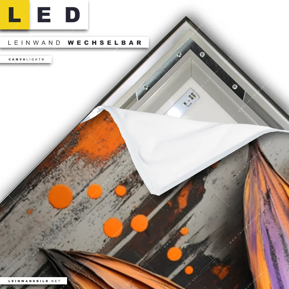 Du konfigurierst Dein individuelles LED Leinwandbild Canvalight® TEX | Abstrakte Blume in Orange & Lila | Schmal und wir produzieren es NEU für Dich. Unsere Blumen - Botanik LED Bilder mit wechselbarer Textil-Leinwand sind KEINE Lagerware. Du bist Dir unsicher, welches Motiv oder Format das richtige für dein individuelles Canvalight® Leuchtbild ist, dann helfen wir dir gerne weiter und beraten dich!