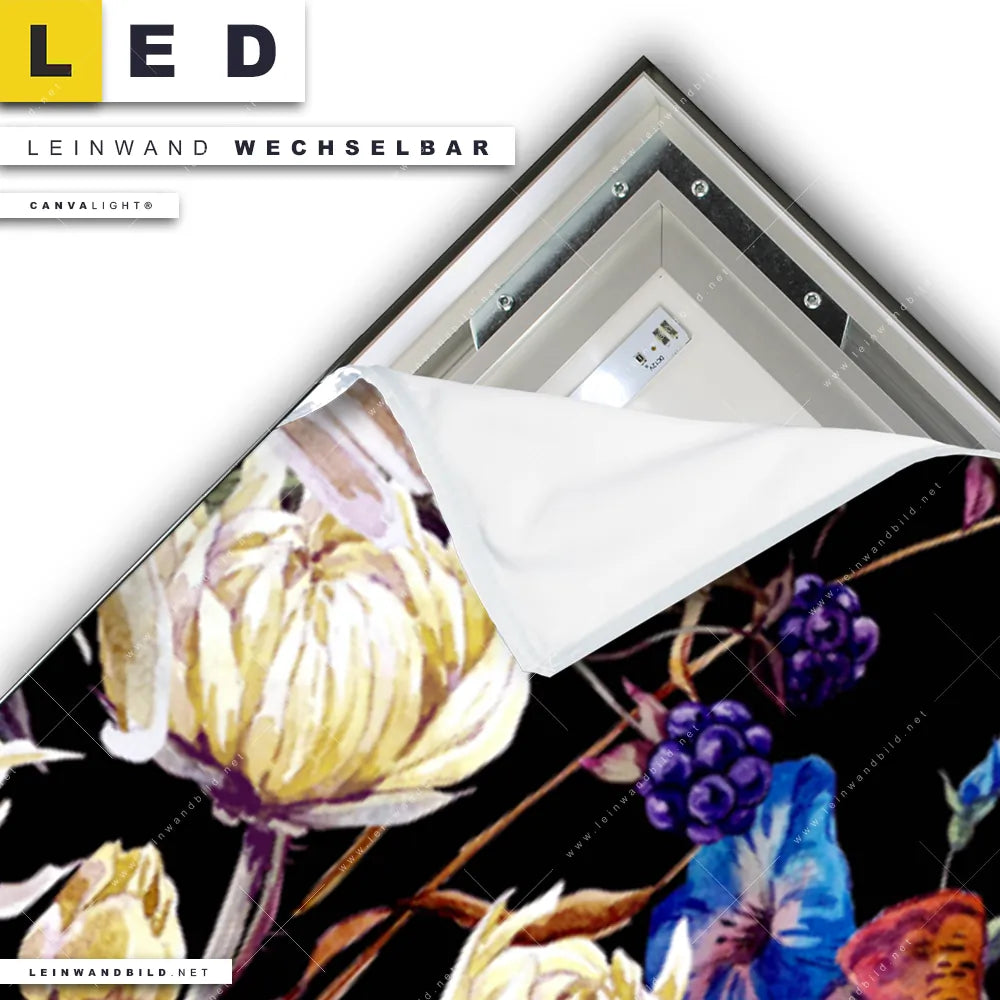 Du konfigurierst Dein individuelles LED Leinwandbild Canvalight® TEX | Aquarell von wilden Blumen | Panorama und wir produzieren es NEU für Dich. Unsere Blumen - Botanik LED Bilder mit wechselbarer Textil-Leinwand sind KEINE Lagerware. Du bist Dir unsicher, welches Motiv oder Format das richtige für dein individuelles Canvalight® Leuchtbild ist, dann helfen wir dir gerne weiter und beraten dich!
