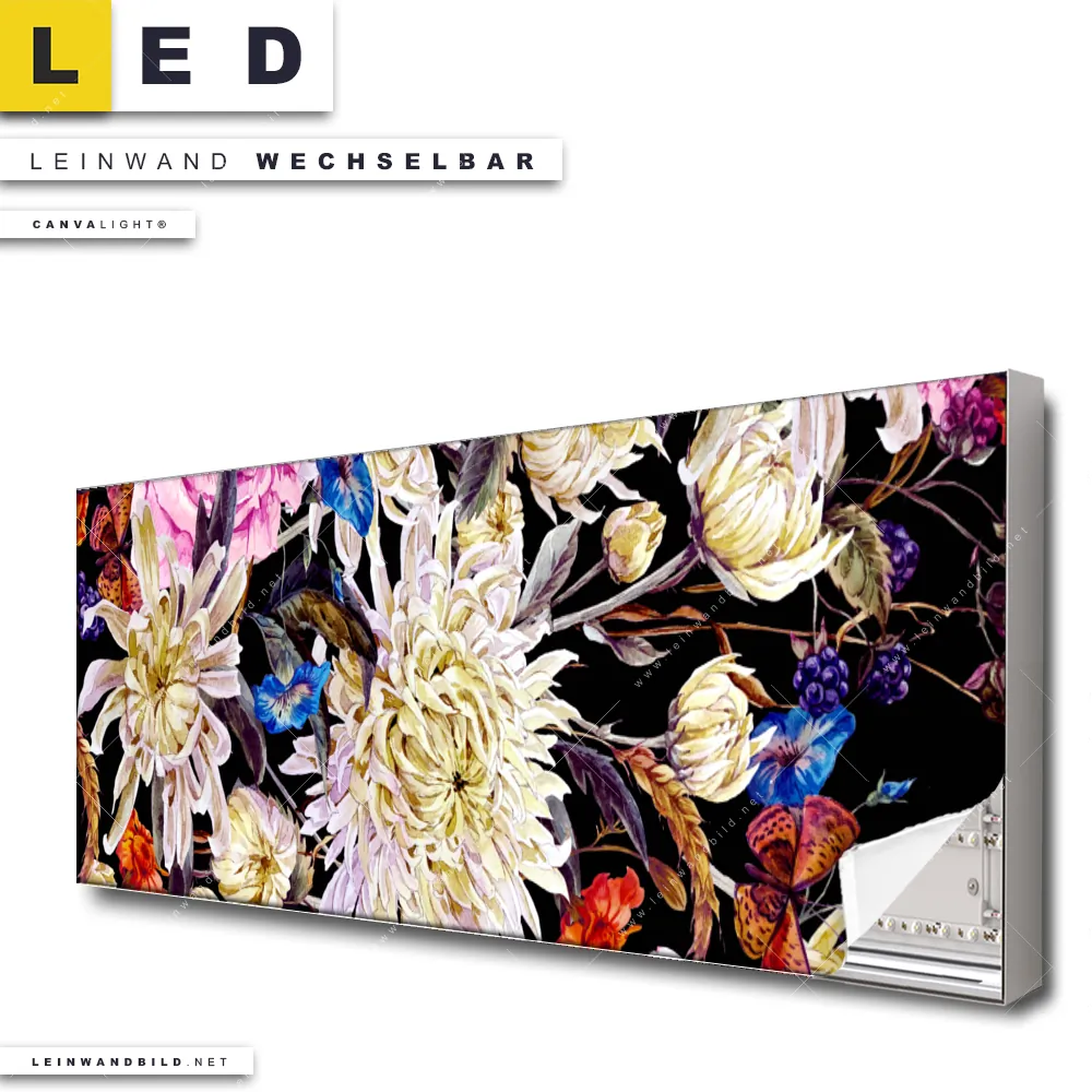 Du bist auf der Suche nach einem Blumen - Botanik LED Leinwandbild im Panorama-Format? Begriffe wie Blume, Botanik, Pflanze, Natur, Aquarell, Wasserfarbe, Blumen, romantisch, Blüten, Bouquet, Blumenstrauß, Schmetterling haben Dich auf der Suche nach Deinem neuen XXL LED Wandbild mit wechselbarer Leinwand inspiriert? Farben wie Weiss, Schwarz, Blau, Lila, Orange, Rot, Rosa dürfen auf Deinem neuen extra breiten Leinwand-LED-Bild nicht fehlen und Leuchtbilder im Floral, Retro - Vintage Stil passen perfekt zu Deinem Einrichtungsstil?