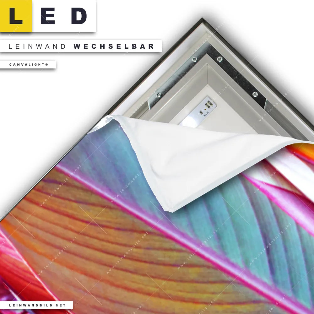 Du konfigurierst Dein individuelles LED Leinwandbild Canvalight® TEX | Blätter in bunten Farben | Schmal und wir produzieren es NEU für Dich. Unsere Muster - Texturen, Blumen - Botanik LED Bilder mit wechselbarer Textil-Leinwand sind KEINE Lagerware. Du bist Dir unsicher, welches Motiv oder Format das richtige für dein individuelles Canvalight® Leuchtbild ist, dann helfen wir dir gerne weiter und beraten dich!