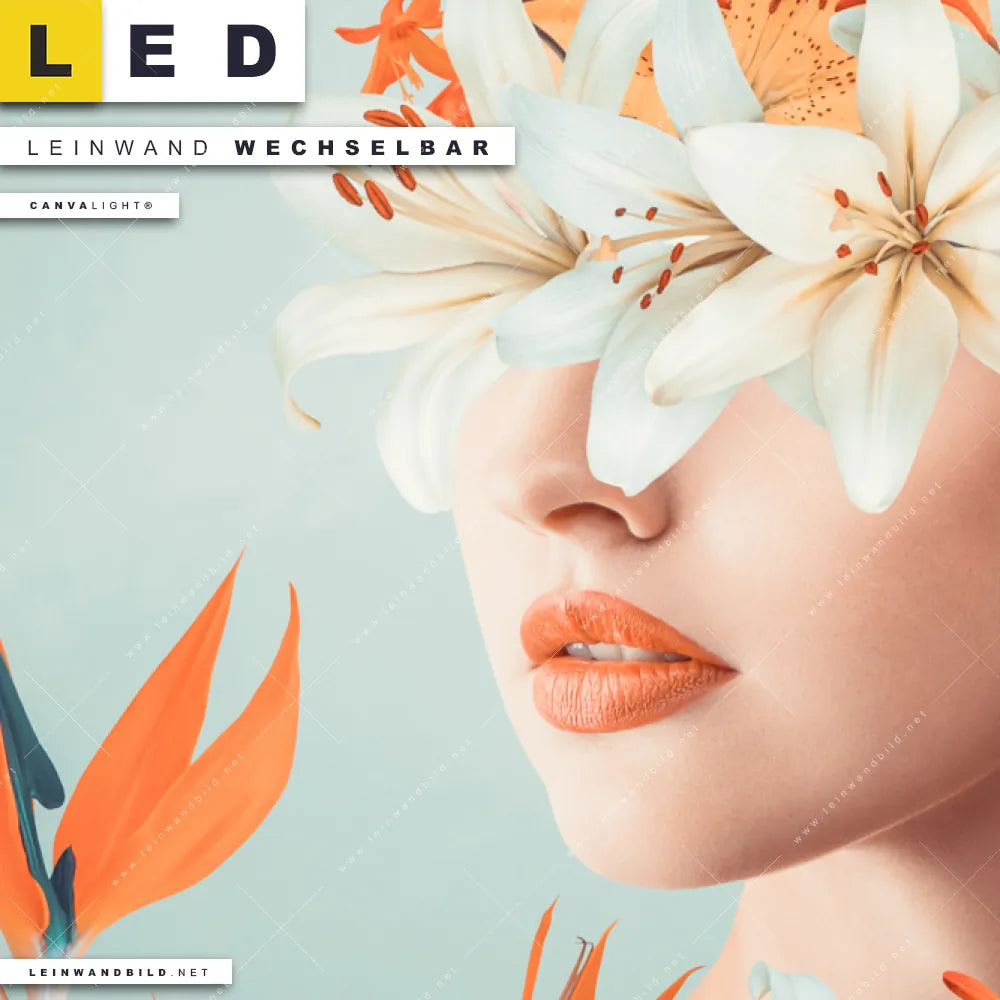 Du bist auf der Suche nach einem Porträts - Menschen, Blumen - Botanik LED Leinwandbild im Panorama-Format? Begriffe wie Menschen & Blumen, Frau, Porträt, Gesicht, Blumen, Blüten, Frisur, Haare haben Dich auf der Suche nach Deinem neuen XXL LED Wandbild mit wechselbarer Leinwand inspiriert? Farben wie Orange, Hellblau, Weiss, Hellgrün dürfen auf Deinem neuen extra breiten Leinwand-LED-Bild nicht fehlen und Leuchtbilder im Modern Art, Floral Stil passen perfekt zu Deinem Einrichtungsstil?