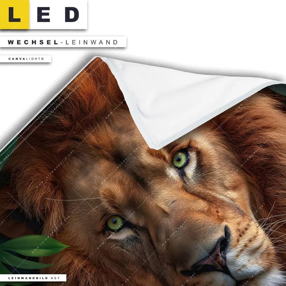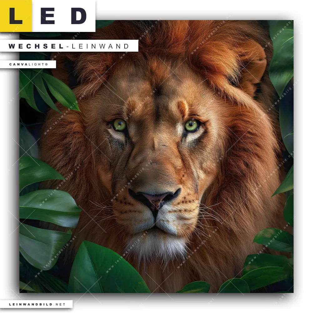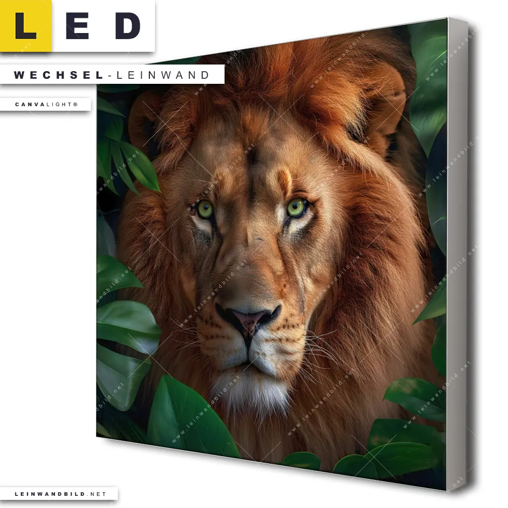 Dann sollte die Wechsel-Leinwand Canvalight® TEX | Löwe im grünen Regenwald | Quadrat den Weg zu Dir finden. Die Austausch-Leinwand Löwe mit grünen Augen - passend für unsere stufenlos dimmbaren, steckerfertigen Leinwandbilder im Leuchtrahmen mit Fernbedienung und optionaler Farbtemperatursteuerung - fügt sich als Eye-Catcher harmonisch in jedes Büro - Kanzlei, Wohnzimmer - Schlafzimmer, Flur - Eingangsbereich Raumkonzept ein.