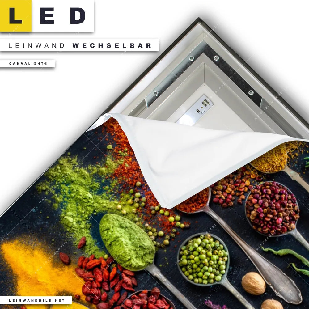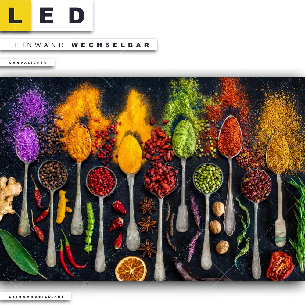 Du bist auf der Suche nach einem Essen - Trinken LED Leinwandbild im Querformat? Begriffe wie Gewürze, Kräuter, Löffel, lecker, Pulver, Pfeffer, Chili, Besteck haben Dich auf der Suche nach Deinem neuen XXL LED Wandbild mit wechselbarer Leinwand inspiriert? Farben wie Schwarz, Bunt dürfen auf Deinem neuen breiten Leinwand-LED-Bild nicht fehlen und Leuchtbilder im Modern Art, Natürlich - Realistisch Stil passen perfekt zu Deinem Einrichtungsstil?