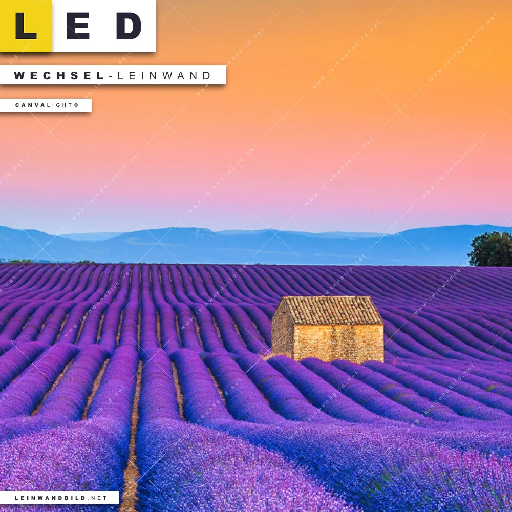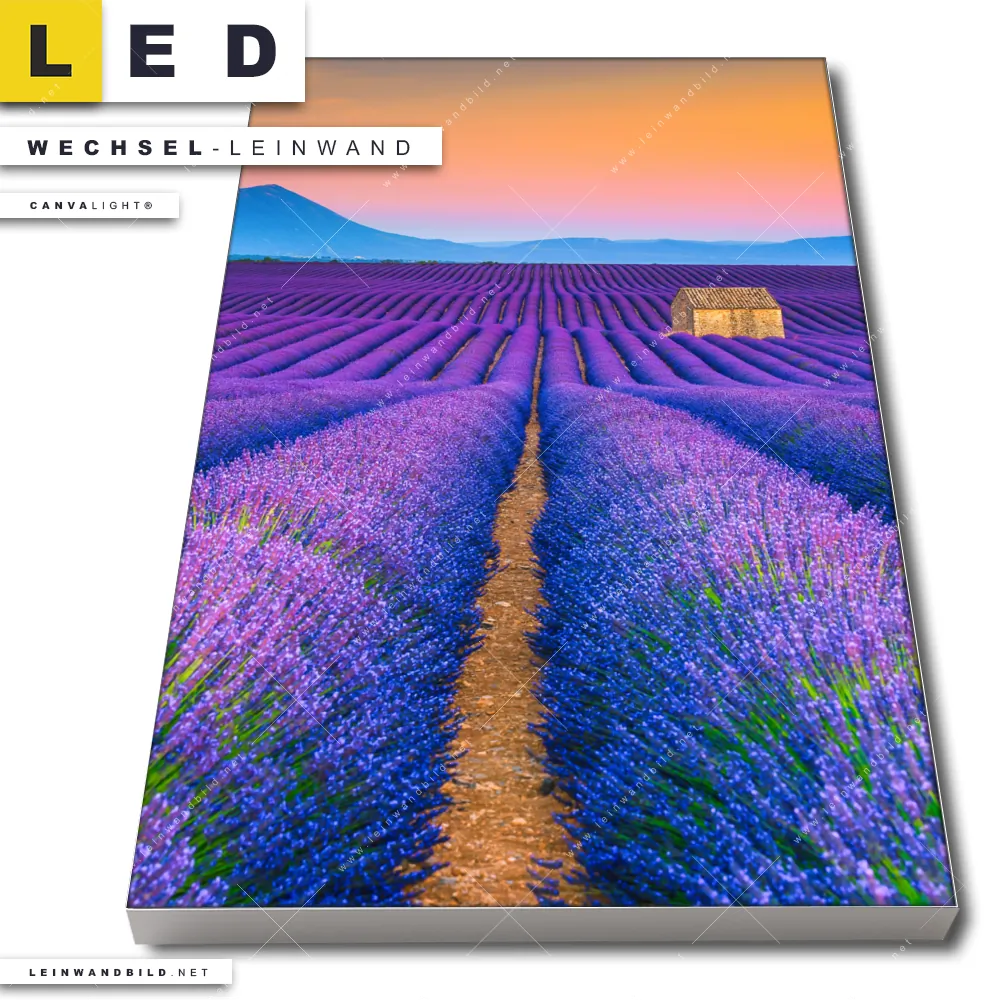 Du bist auf der Suche nach einer Landschaften Wechsel-Leinwand für Dein LED-Leinwandbild im Hochformat? Begriffe wie Blumen, Lavendel, Baum, Feld, Sonnenuntergang, Wiese, Himmel haben Dich auf der Suche nach Deiner Ersatz-Leinwand für dein LED Wandbild mit wechselbarer Leinwand inspiriert? Farben wie Lila, Orange dürfen auf Deinem neuen Wechselmotiv für Dein XXL Leinwand-LED-Bild nicht fehlen und Leinwände im Floral, Natürlich - Realistisch Stil für Leuchtbilder passen perfekt zu Deinem Einrichtungsstil?