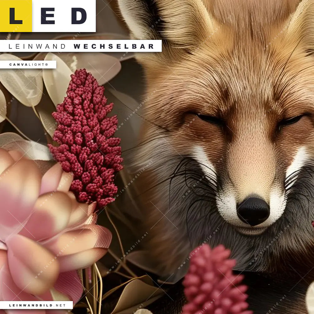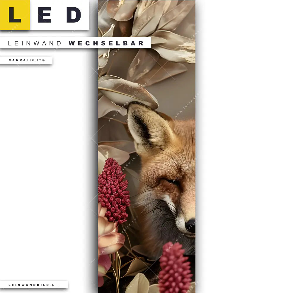 Du bist auf der Suche nach einem Tierwelt, Blumen - Botanik LED Leinwandbild im Schmalen Format? Begriffe wie Fuchs, Natur, Rotfuchs, Tier, Tierporträt, Nahaufnahme, Blätter, Blumen, Blüten haben Dich auf der Suche nach Deinem neuen XXL LED Wandbild mit wechselbarer Leinwand inspiriert? Farben wie Braun, Beige, Pink, Rosa, Gold dürfen auf Deinem neuen Leinwand-LED-Bild im Panorama-Hochformat nicht fehlen und Leuchtbilder im Floral, Retro - Vintage Stil passen perfekt zu Deinem Einrichtungsstil?