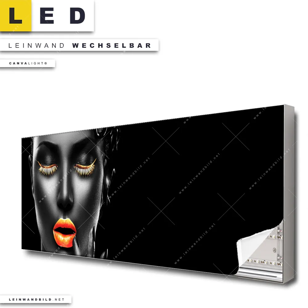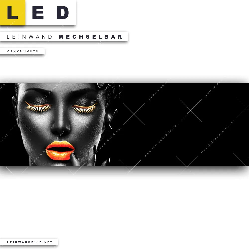 Du bist auf der Suche nach einem Porträts - Menschen LED Leinwandbild im Panorama-Format? Begriffe wie Frau, Lippen, Mund, Porträt, Erotik, modern, Gold, Silber, Farbe, Beauty haben Dich auf der Suche nach Deinem neuen XXL LED Wandbild mit wechselbarer Leinwand inspiriert? Farben wie Gold, Silber, Schwarz dürfen auf Deinem neuen extra breiten Leinwand-LED-Bild nicht fehlen und Leuchtbilder im Modern Art, Schwarz - Weiss Stil passen perfekt zu Deinem Einrichtungsstil?